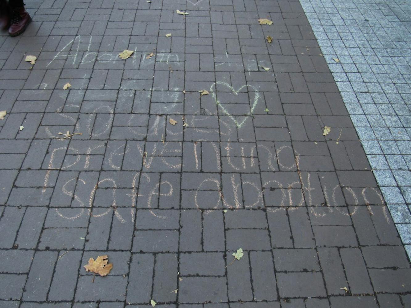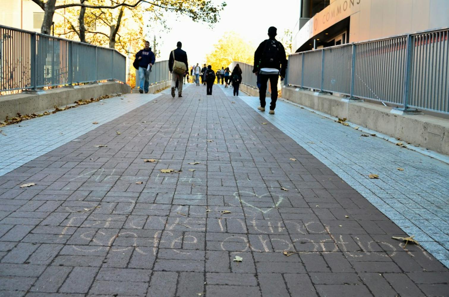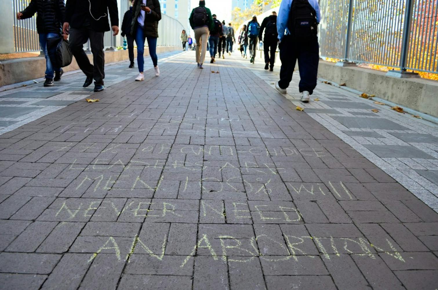 Covered in chalk, Locust Walk turned into a battleground Thursday morning. When pro-life groups wrote various messages on Locust, pro-choice students responded by crossing out, erasing, and commenting on the messages. This call and response was evident along Locust on the western end of campus from the compass to the bridge.