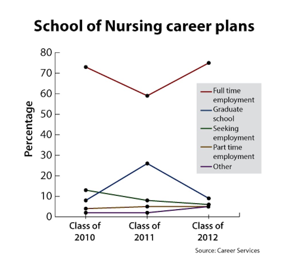 The Nursing class of 2012 saw about 75 percent of its graduates fully employed by the fall of 2012. About 9 percent went on to continue graduate school education and the rest were either partially employed or seeking employment. The top employers were the Hospital of the University of Pennsylvania and Children’s Hospital of Philadelphia. The class of 2011 saw lower statistics in full-time employment with 59 percent working full time, but saw a larger number of students who sought graduate education.