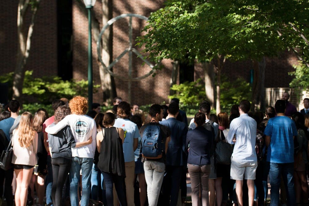 More than a hundred students gathered on Sept. 8 outside Van Pelt Library to commemorate the life of Nicholas Moya, a College senior and former president of Sigma Alpha Mu, who died by suicide on Aug. 31.