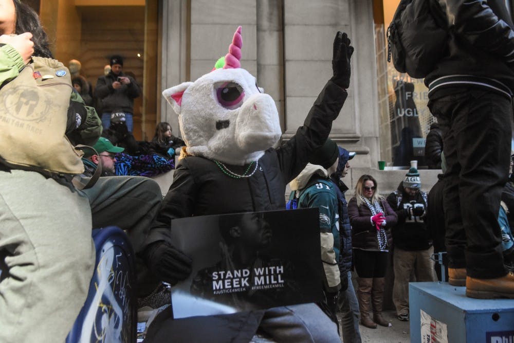 With a unicorn headpiece and a “Stand with Meek Mill” sign, Minh Truong was easily identifiable in the sea of green that extended across City Hall.