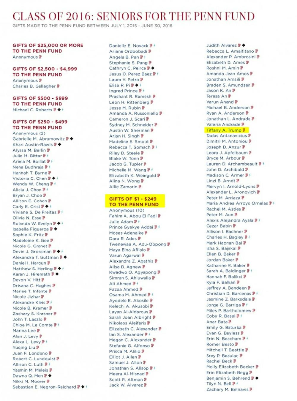 Ivanka Trump donated between $5,000 and $9,999 in the 2010-2011 school years. Donald Trump Jr. donated between $1,000 and $2,499 to the Penn Fund in the 2010-2011, 2011-2012, 2012-13, 2013-14, and 2014-15 school years. Tiffany Trump donated between $1 and $249 once in the 2015-16 school year.