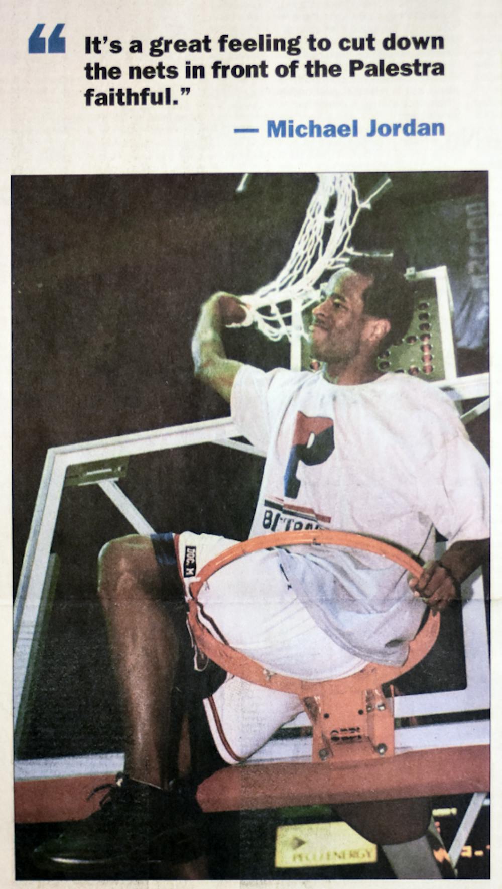 In a recreation of one of the Palestra’s most iconic moments, Mike Jordan sitting on the hoop after the victory, Foreman climbed onto the rim and waved the liberated net over his head.