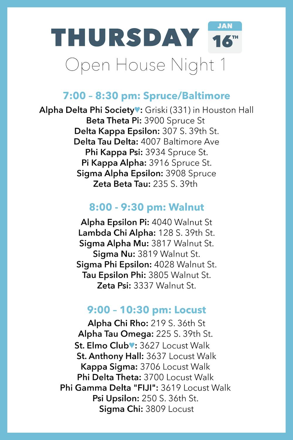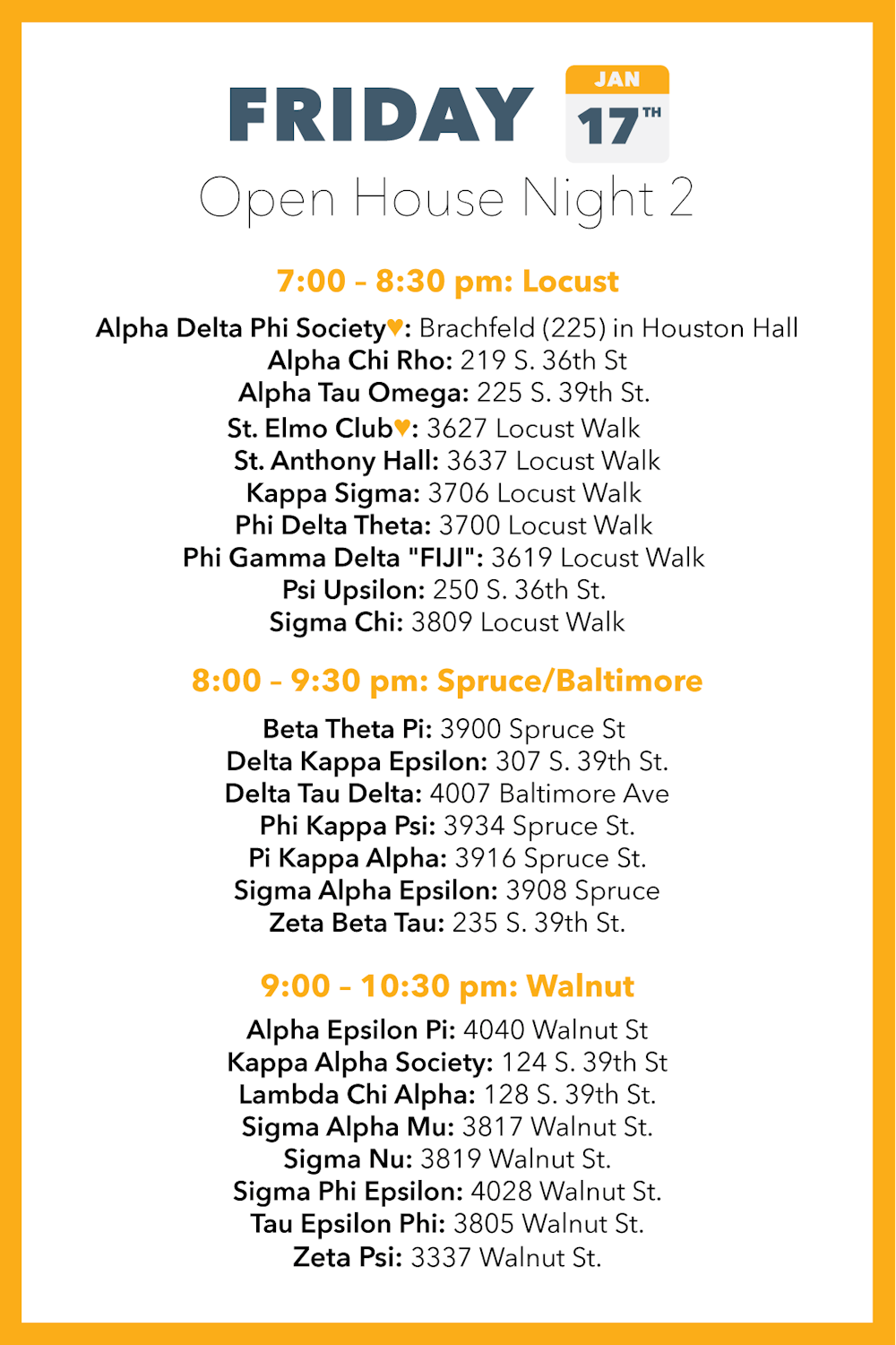 Nine fraternities on Locust Walk will have events from 9-10:30 p.m. on Thursday and 7-8:30 p.m. on Friday. Eight fraternities on Walnut Street can be visited from 8-9:30 p.m. on Thursday and 9-10:30 p.m. on Friday. Eight fraternities on Spruce Street and Baltimore Avenue are open from 7-8:30 on Thursday and 8-9:30 p.m. on Friday.