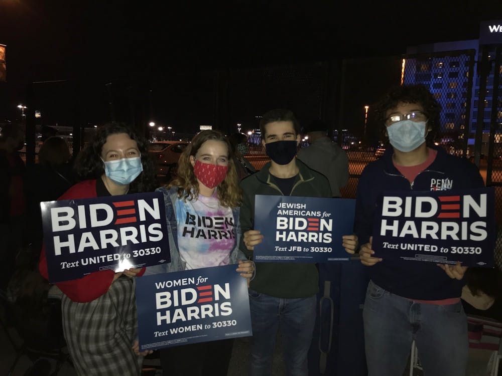 (From left to right) Penn Democrats members Sydney Ellman, Emma Wennberg, Noah Lewine, and Michael Nevett journeyed to Wilmington, De., the site of Biden campaign headquarters, on Nov. 6. (Photo from Michael Nevett)
