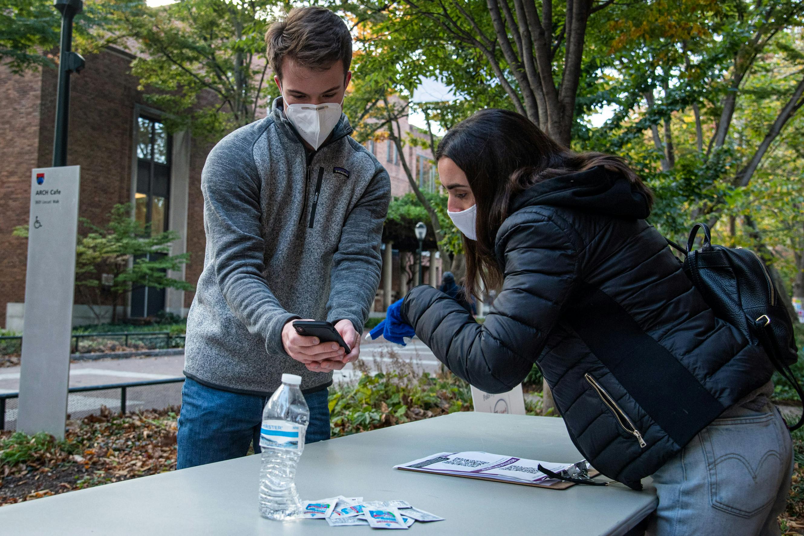 Nov. 3: College senior Anna Lisa Lowenstein, a student poll worker, helped a student find his division number outside the ARCH building polling location on Election Day. More than 1,000 votes were cast at Houston Hall, ARCH, and Walnut Street West Library.