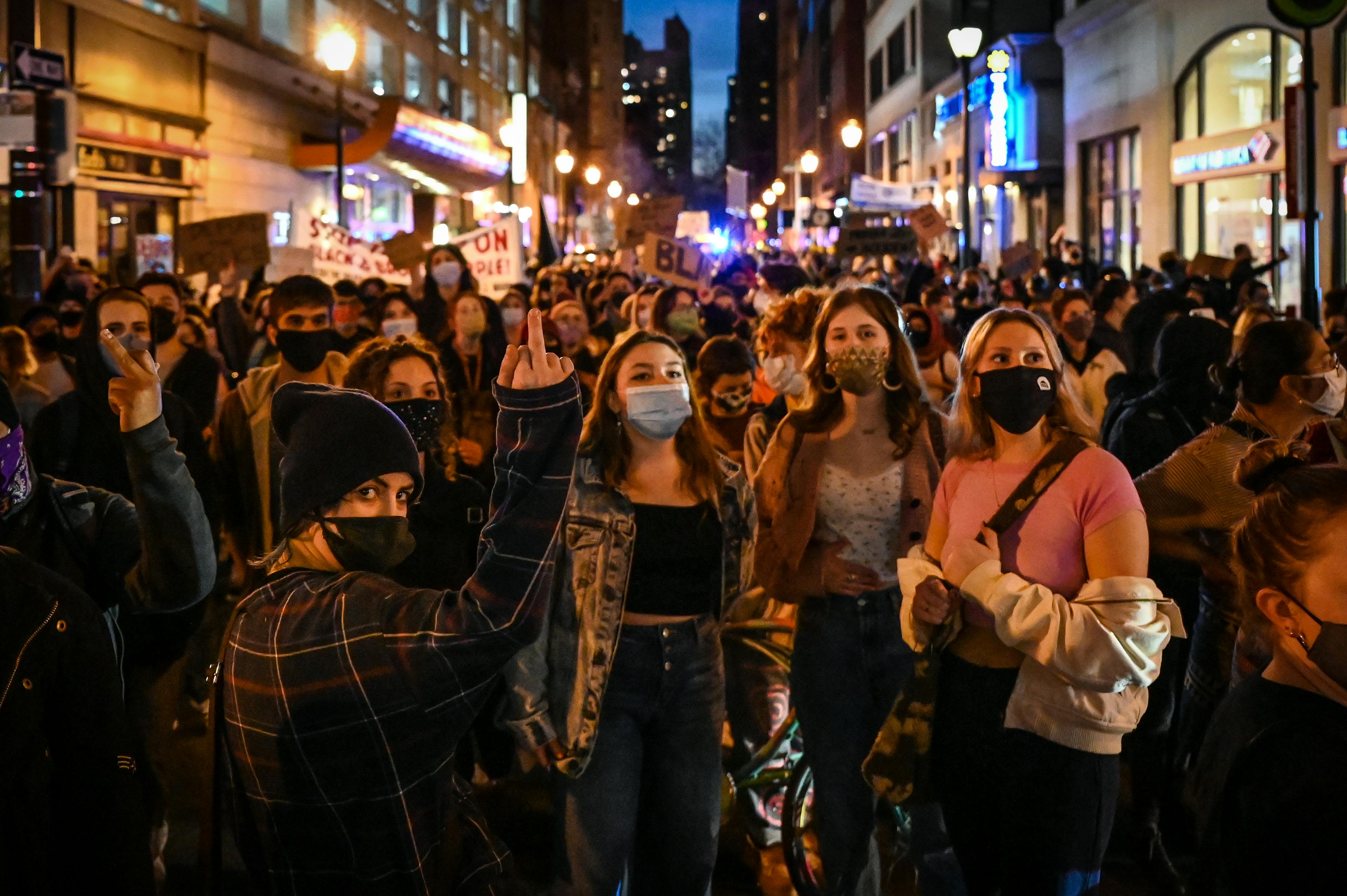 Demonstrators marched through Philadelphia Tuesday night as part of the Justice for Daunte Wright protest. Wright, a 20-year-old Black man, was shot and killed by white police officer Kim Potter during a traffic stop in Brooklyn Center, Minn. on Sunday. The protesters called for justice for Black and transgender lives, as well as the abolition of the police. Earlier in the day, Potter resigned as a Brooklyn Center police officer. On April 14, Potter was arrested and charged with second-degree manslaughter.