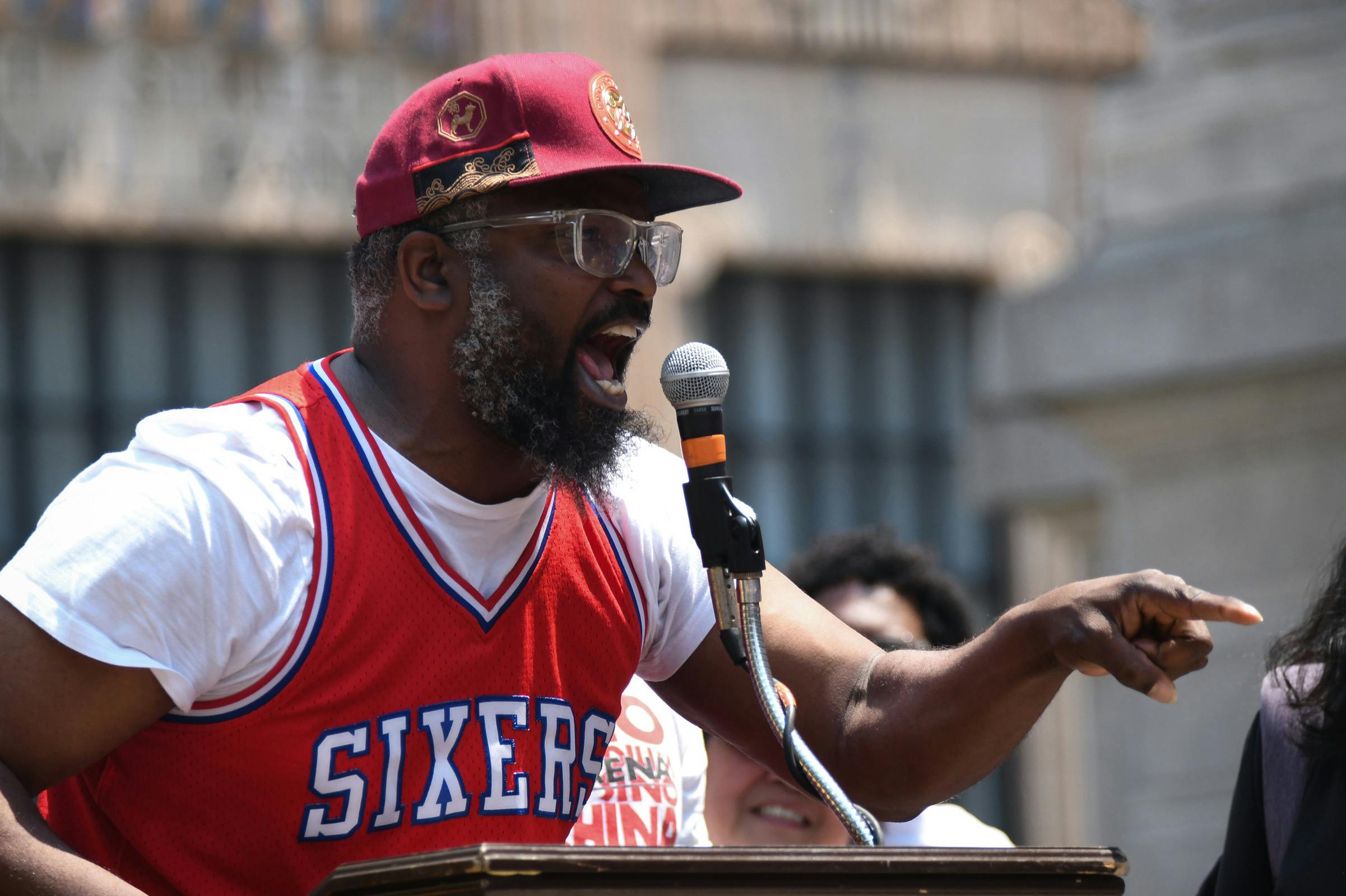 Shawmar Pitts, co-director of Philly Thrive, gave an energetic speech during the march, wearing his Sixers jersey to demonstrate that his love for the team could coexist with his disapproval of their arena plans.