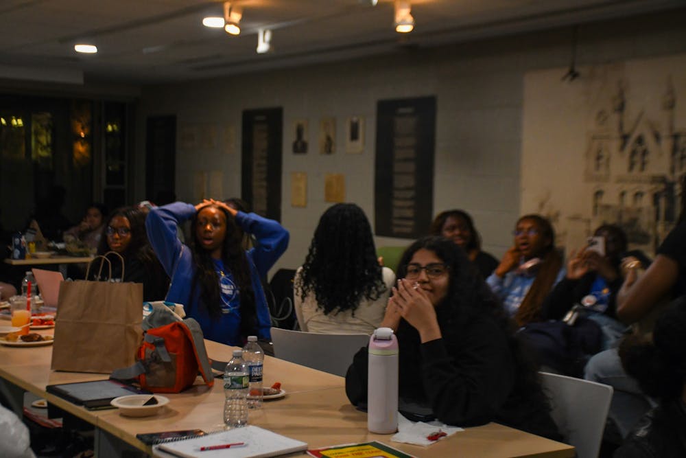 Students chattered, yelled across the room at times, and crowded around the couch debating which candidate would win each state. Harris’ win of New York elicited cheers from the audience.