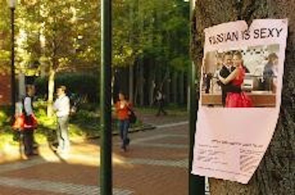 Other signs shout out, "Russian is Sexy," stapled to trees around campus.