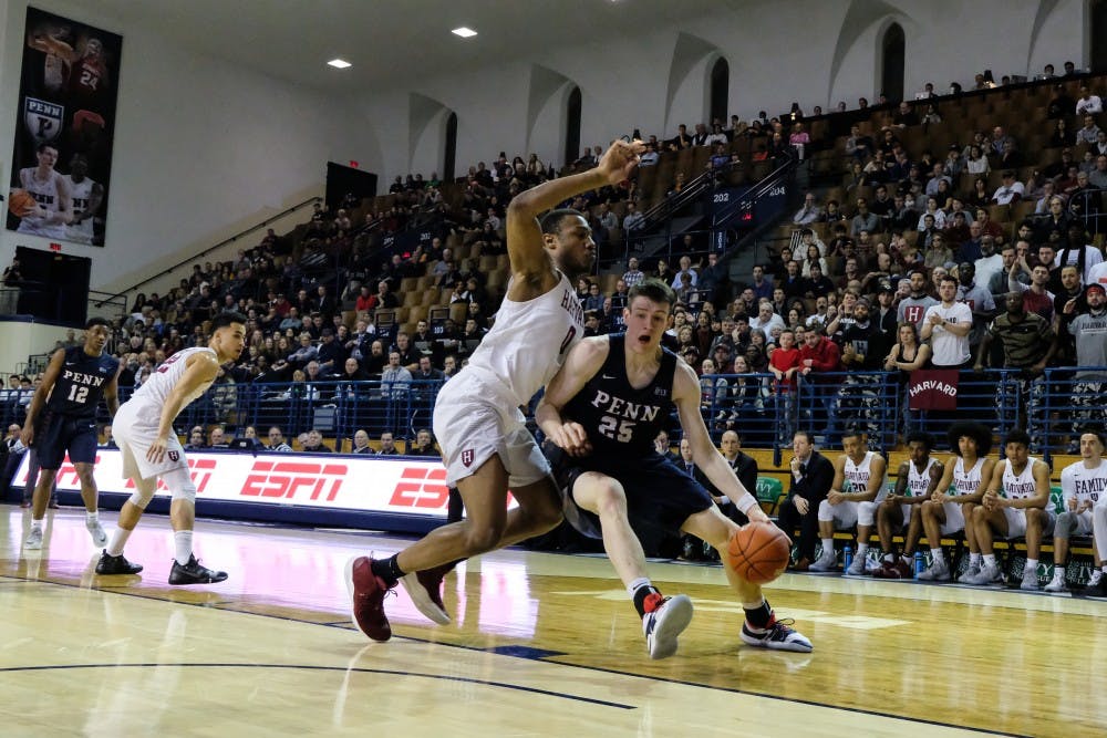 The first few minutes of the game were all Quakers. Behind a swarming defensive effort, Penn forced Harvard into off-balanced, contested looks and held them off the scoreboard until the 16-minute mark. But during that stretch, the Red and Blue had offensive troubles of their own, committing several turnovers that prevented them from opening up a sizable lead.
