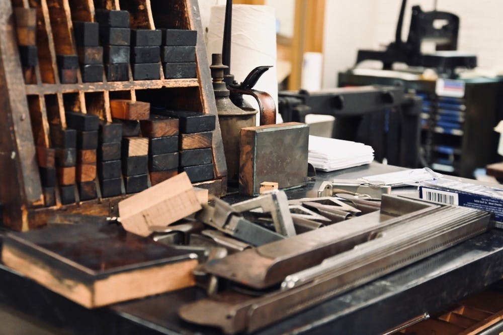 Common Press has wood and metal type (raised engravings in the shape of letters, numbers, and symbols) available for students. It even has the original Times Roman, as Times New Roman only arose when digital printing was invented. Tasillo said that letterpress printing inks do not fade as quickly as digital printing, and old printing papers hold up longer over time because they were made of rags, not trees.