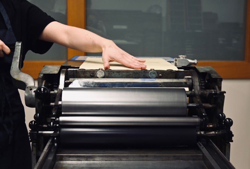 Common Press also hosts events. Most recently, they hosted a Mother’s and Father’s Day card event where students could use the equipment in the studio to make cards for their loved ones. Pictured above is an inking roller that places ink on the card by rolling the paper through the machine.
