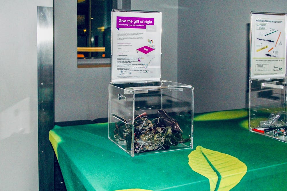 Eyeglasses should be thrown away in either the rear kitchen of FRES, Levy Lobby, Staff Lounge of Tanenbaum Hall, Room 102 of the Clinical Research Building, or the main entrance of Fagin Hall.