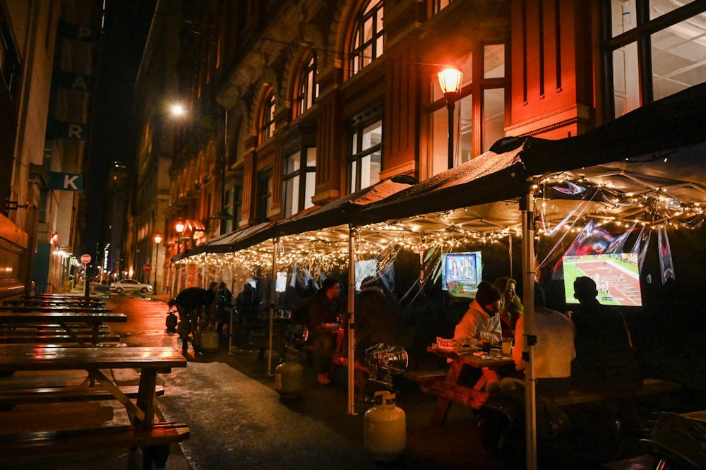 Outdoor diners at Tradesman's in Center City were kept warm by heat lamps in the 30°F weather.
