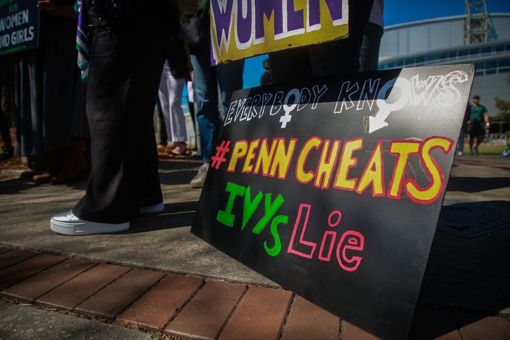 At the entrance of the Georgia Tech McAuley Aquatic Center, the host venue of the championships, protestors against Thomas’ participation in the championship lined the sidewalk with signs reading “Save Women’s Sports.”
