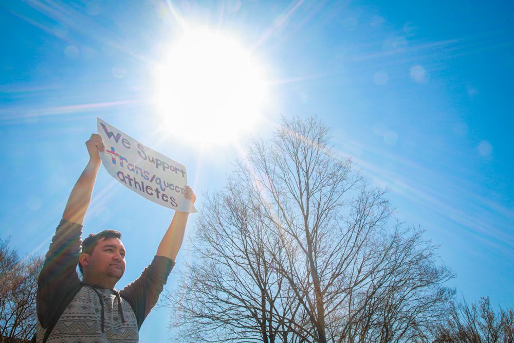Counter-protestors held signs in solidarity with transgender athletes and chanted against the hate speech and discrimination directed at Thomas.