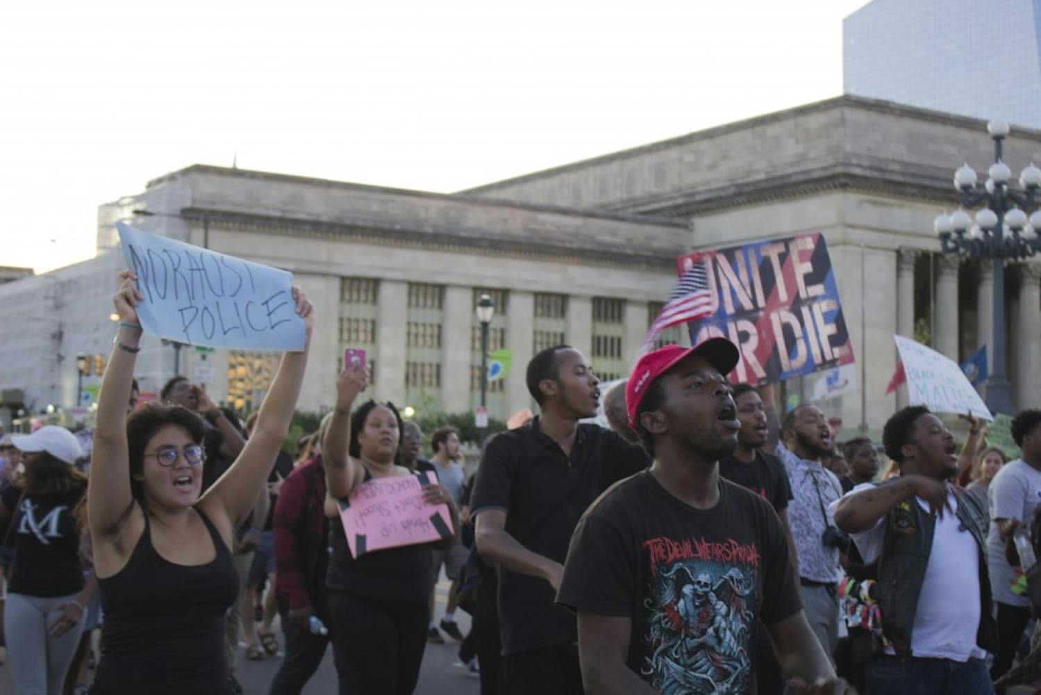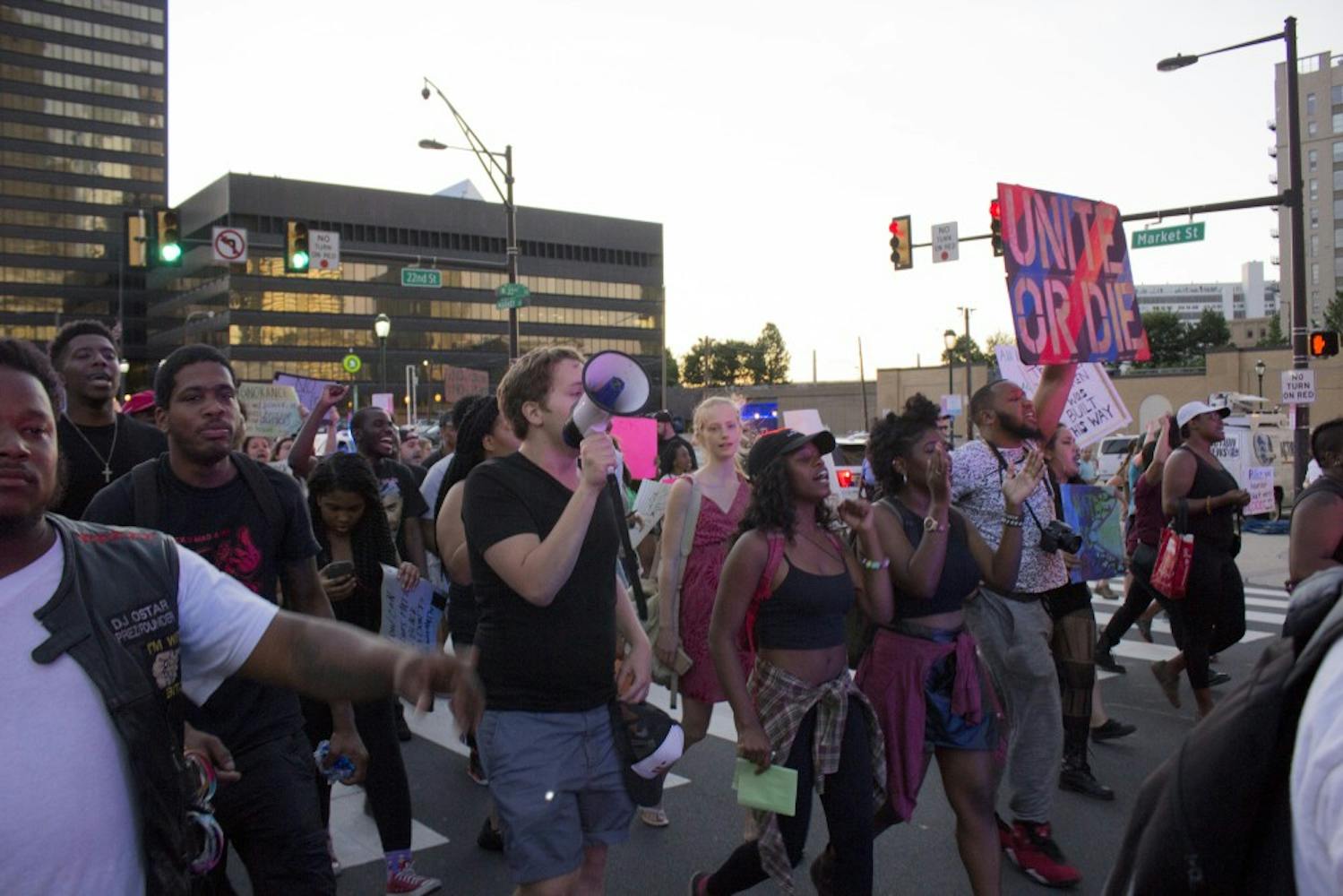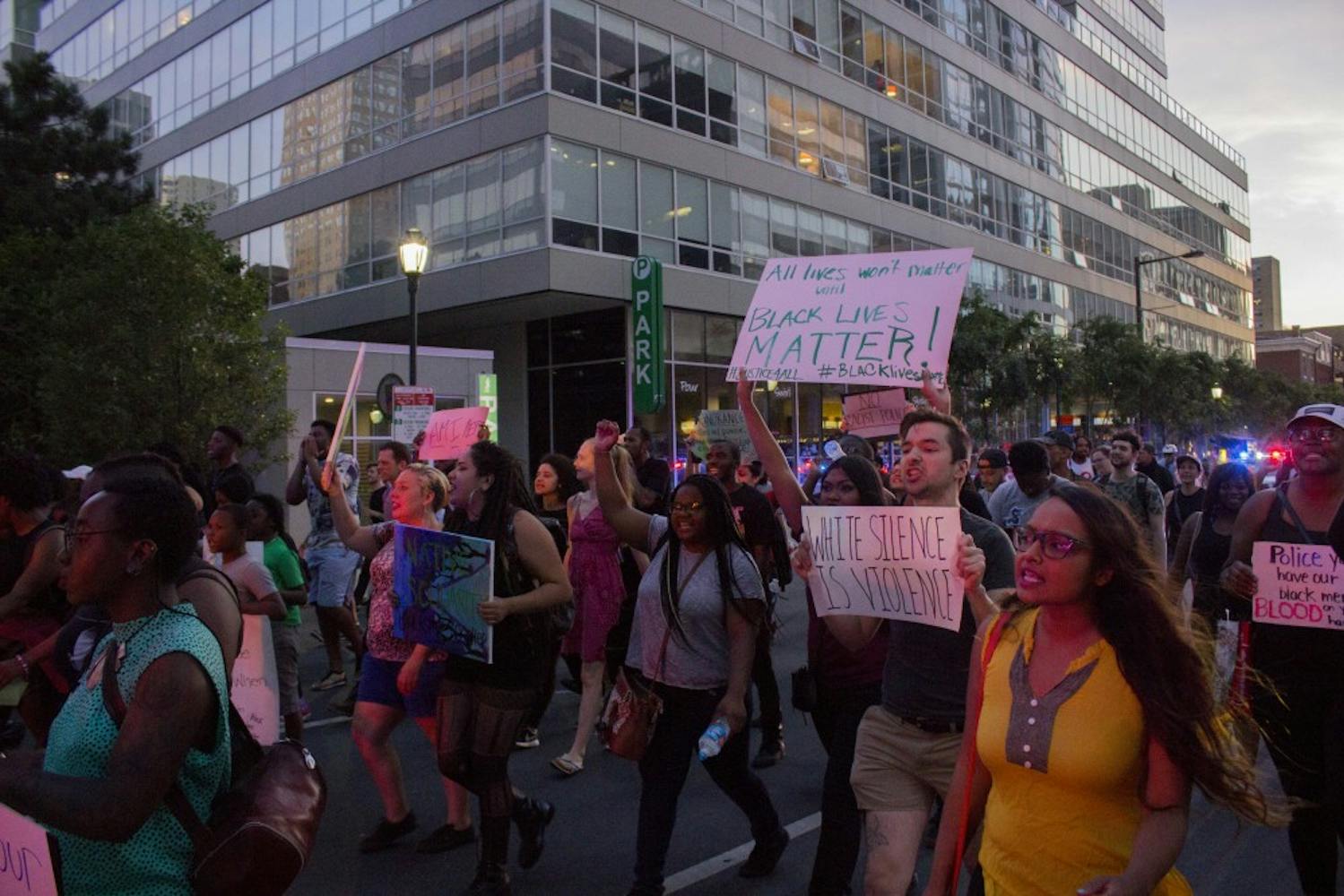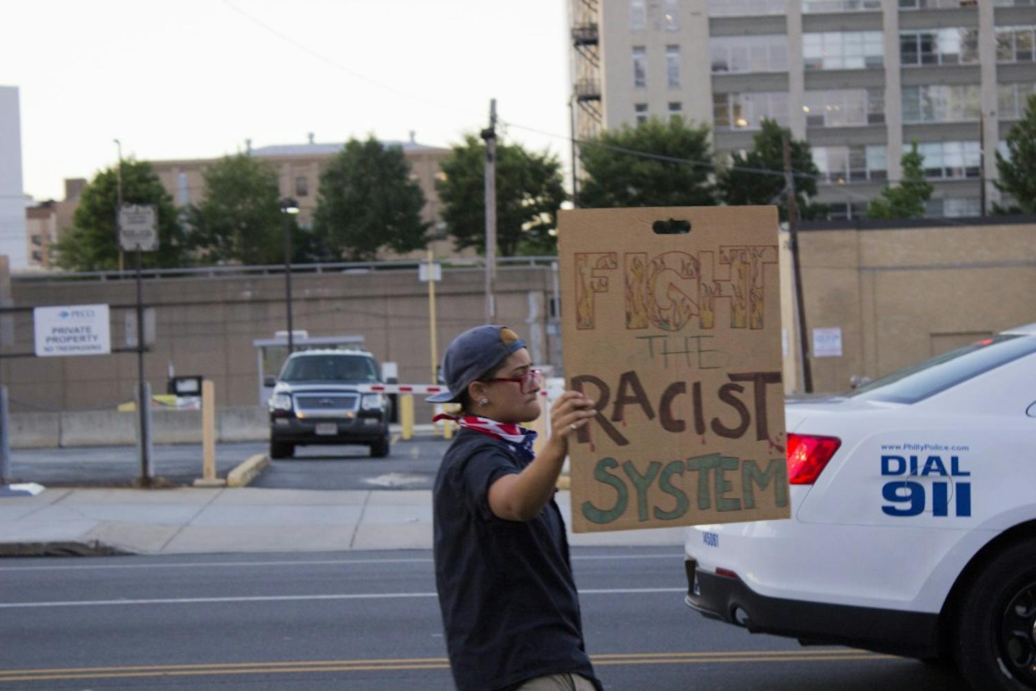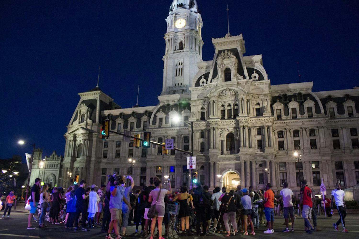 Black Lives Matter protesters marched past Penn's campus on Market Street around 8 p.m. on Sunday. They held signs and chanted, "Show me what democracy looks like, this is what democracy looks like," and "What do we want? Justice. If we don't get it? Shut it down." The march progressed to City Hall, with intermittent stops to allow individuals to speak about their experiences with racism and share ideas to enact tangible change. At City Hall, the largest group of people gathered to chant and share ideas and experiences, and then the march continued past it.