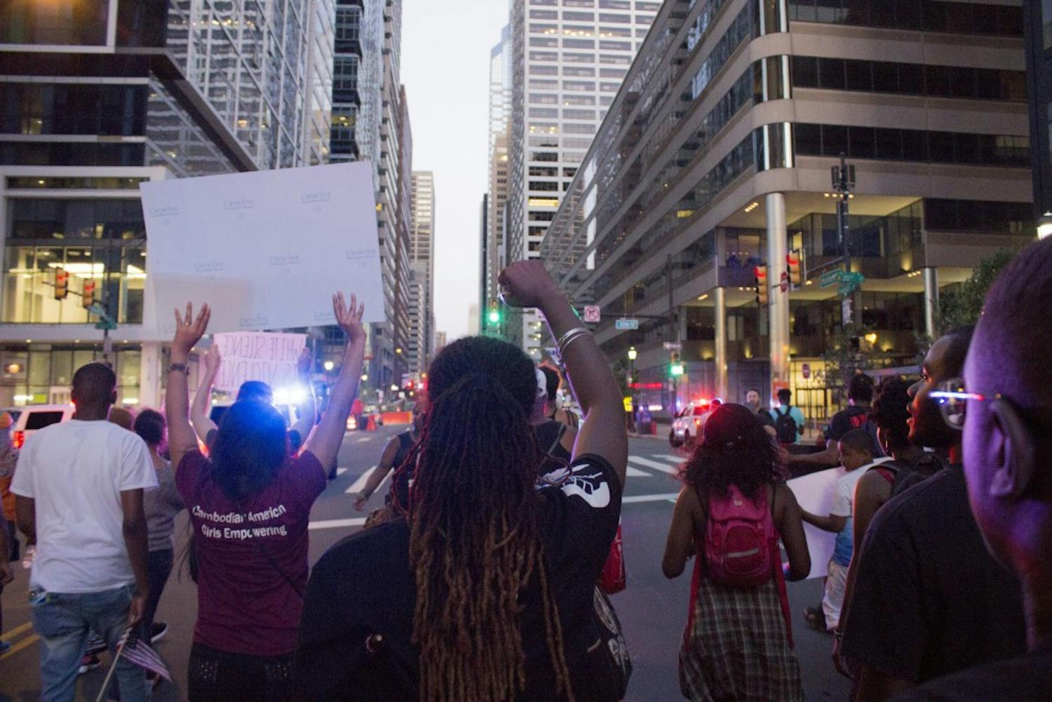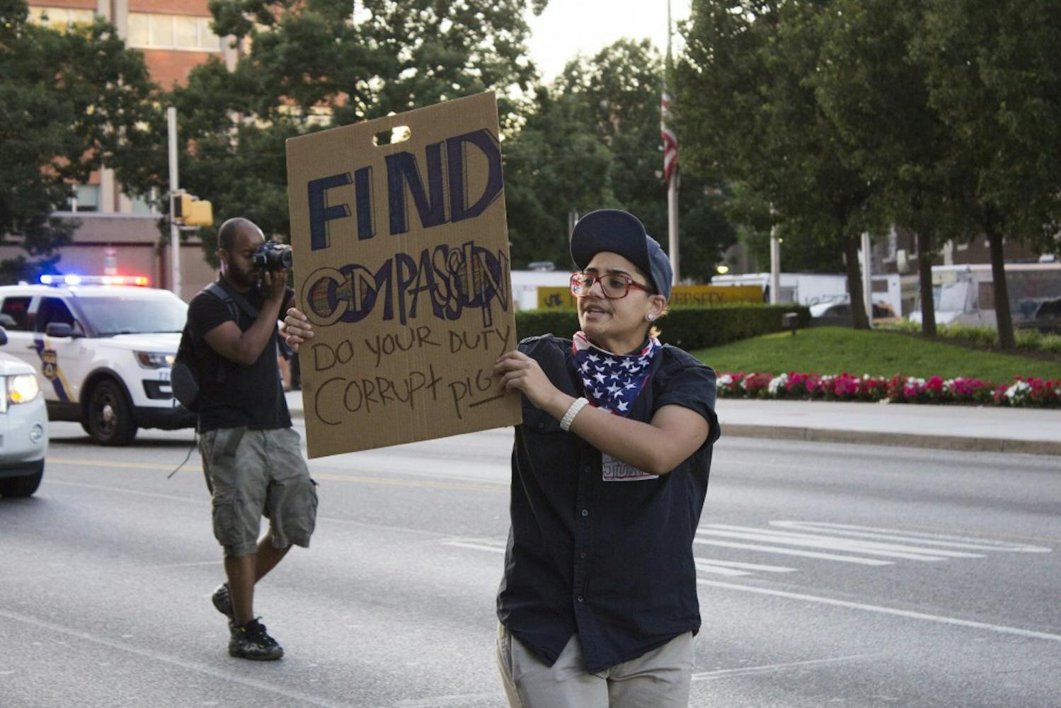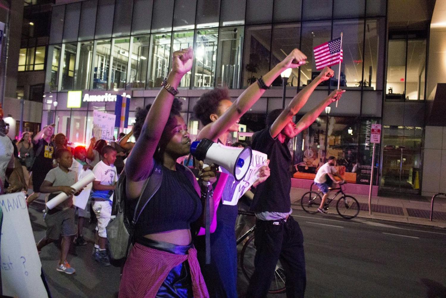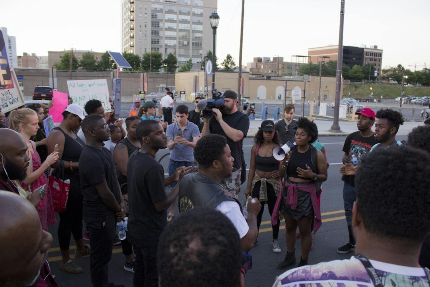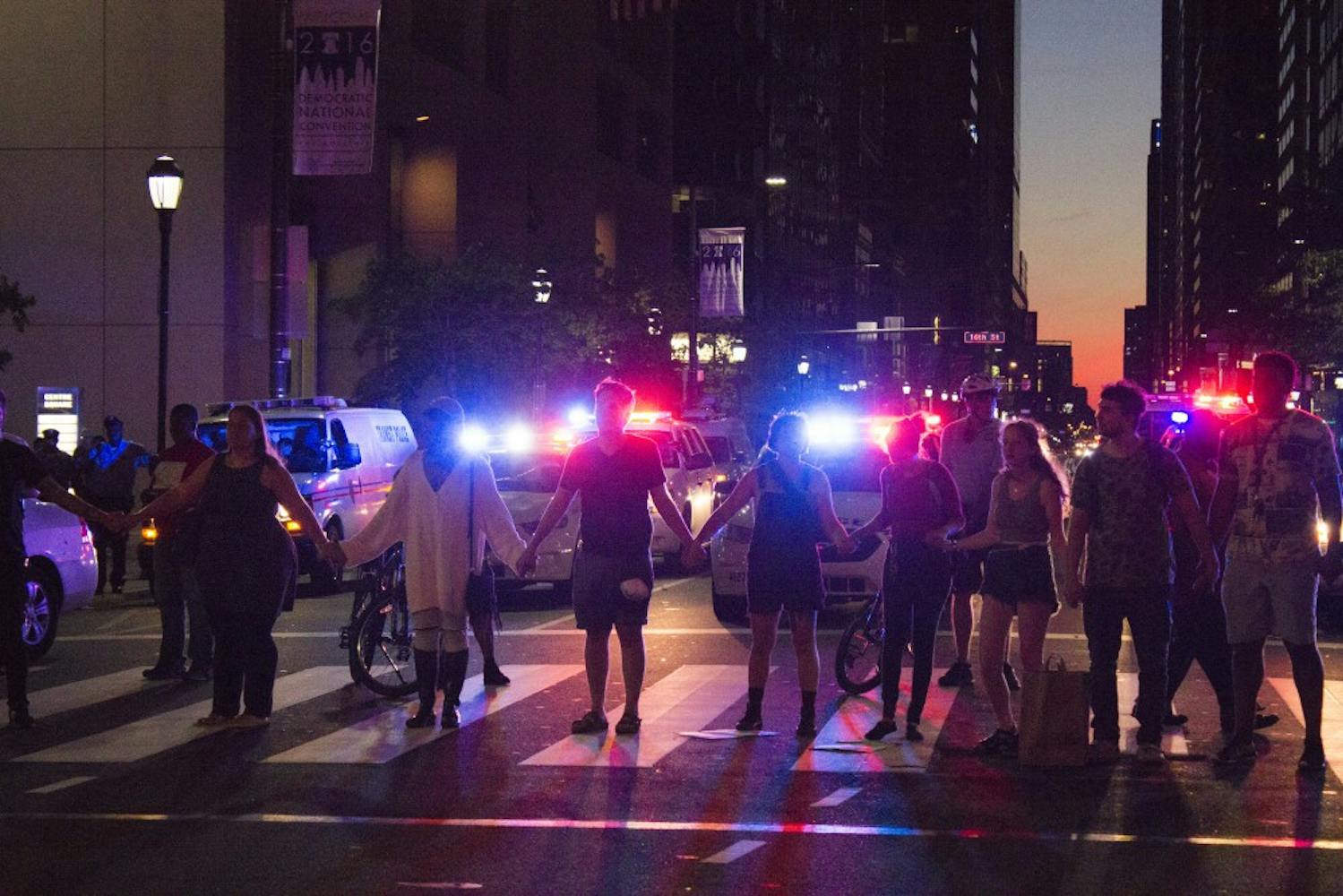 Black Lives Matter protesters marched past Penn's campus on Market Street around 8 p.m. on Sunday. They held signs and chanted, "Show me what democracy looks like, this is what democracy looks like," and "What do we want? Justice. If we don't get it? Shut it down." The march progressed to City Hall, with intermittent stops to allow individuals to speak about their experiences with racism and share ideas to enact tangible change. At City Hall, the largest group of people gathered to chant and share ideas and experiences, and then the march continued past it.