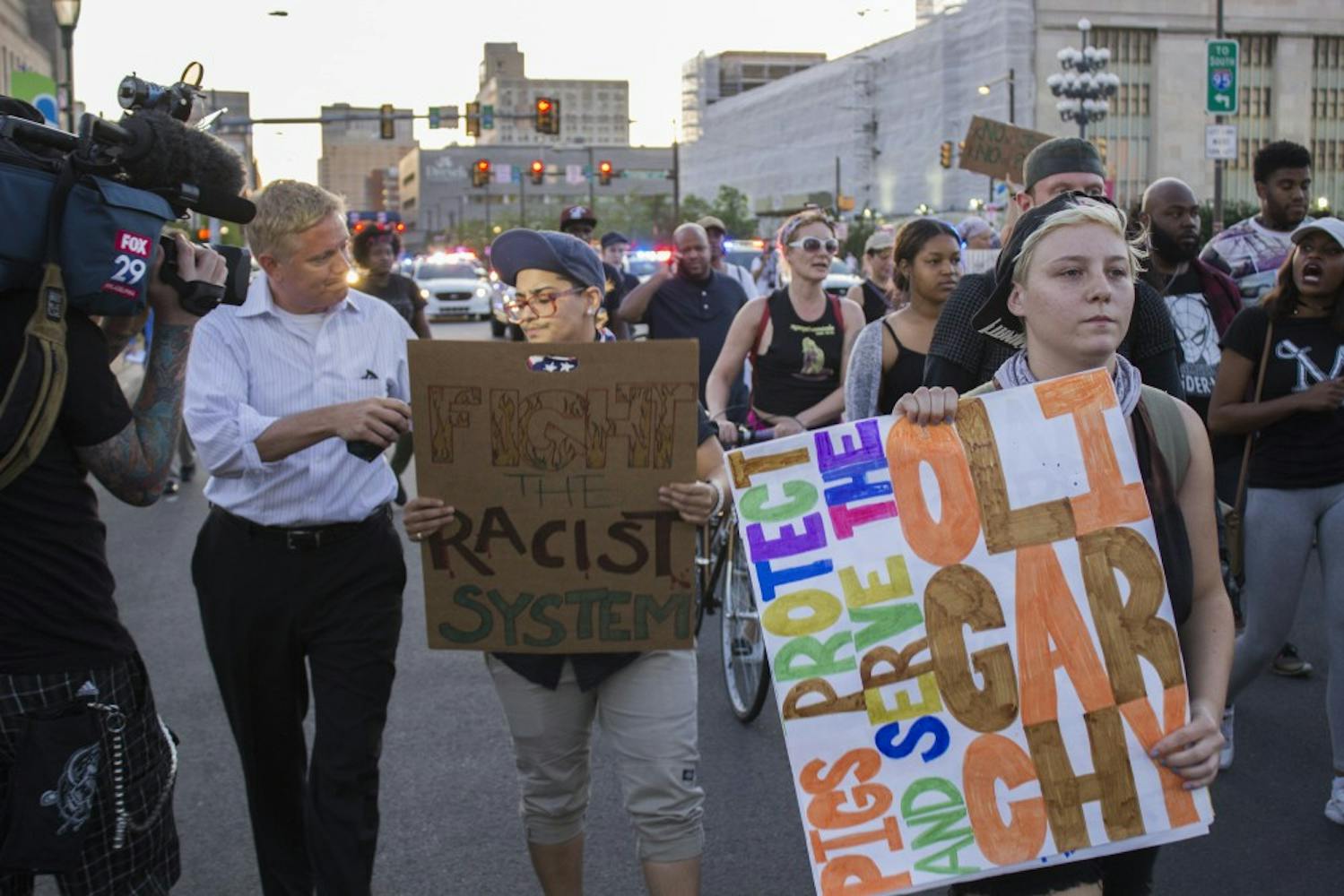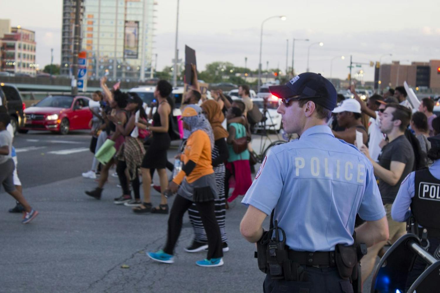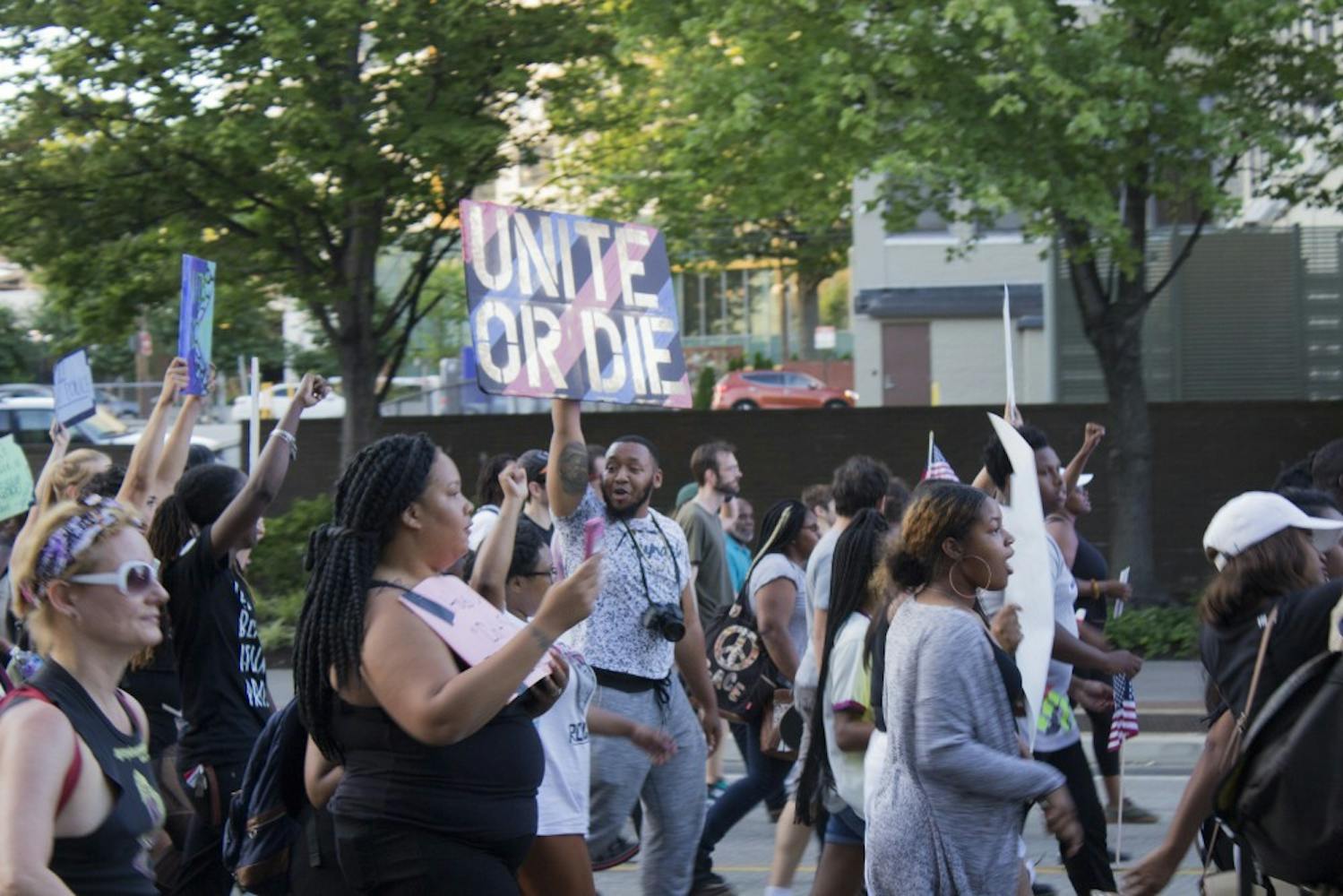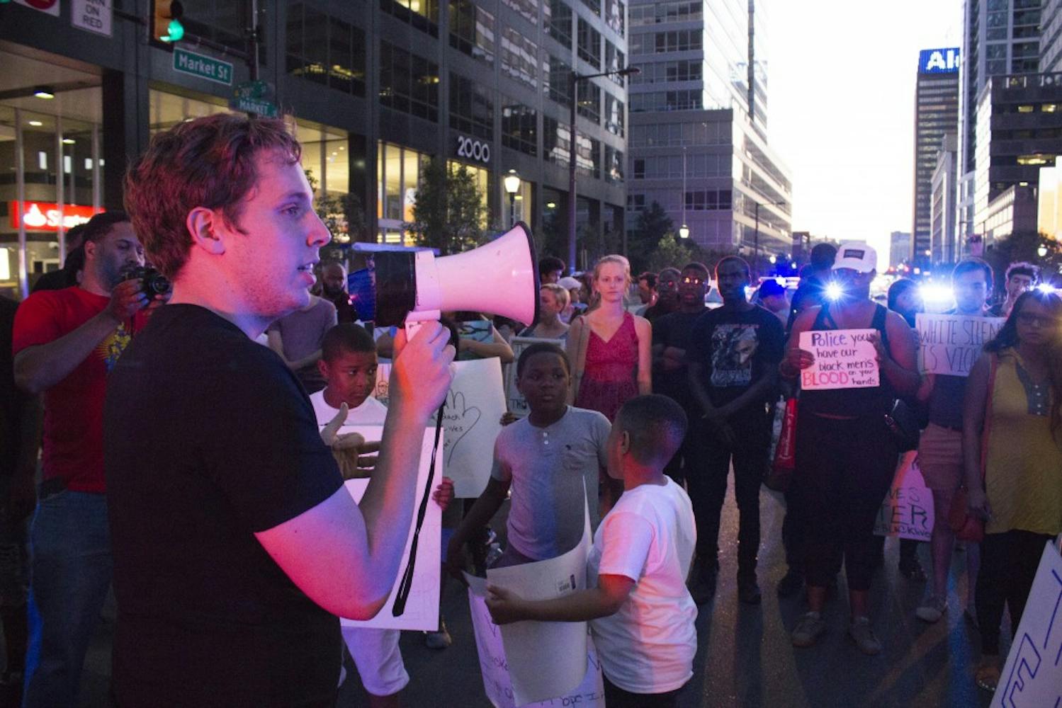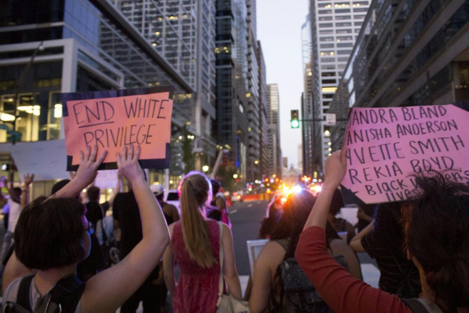 Black Lives Matter protesters marched past Penn's campus on Market Street around 8 p.m. on Sunday. They held signs and chanted, "Show me what democracy looks like, this is what democracy looks like," and "What do we want? Justice. If we don't get it? Shut it down." The march progressed to City Hall, with intermittent stops to allow individuals to speak about their experiences with racism and share ideas to enact tangible change. At City Hall, the largest group of people gathered to chant and share ideas and experiences, and then the march continued past it.