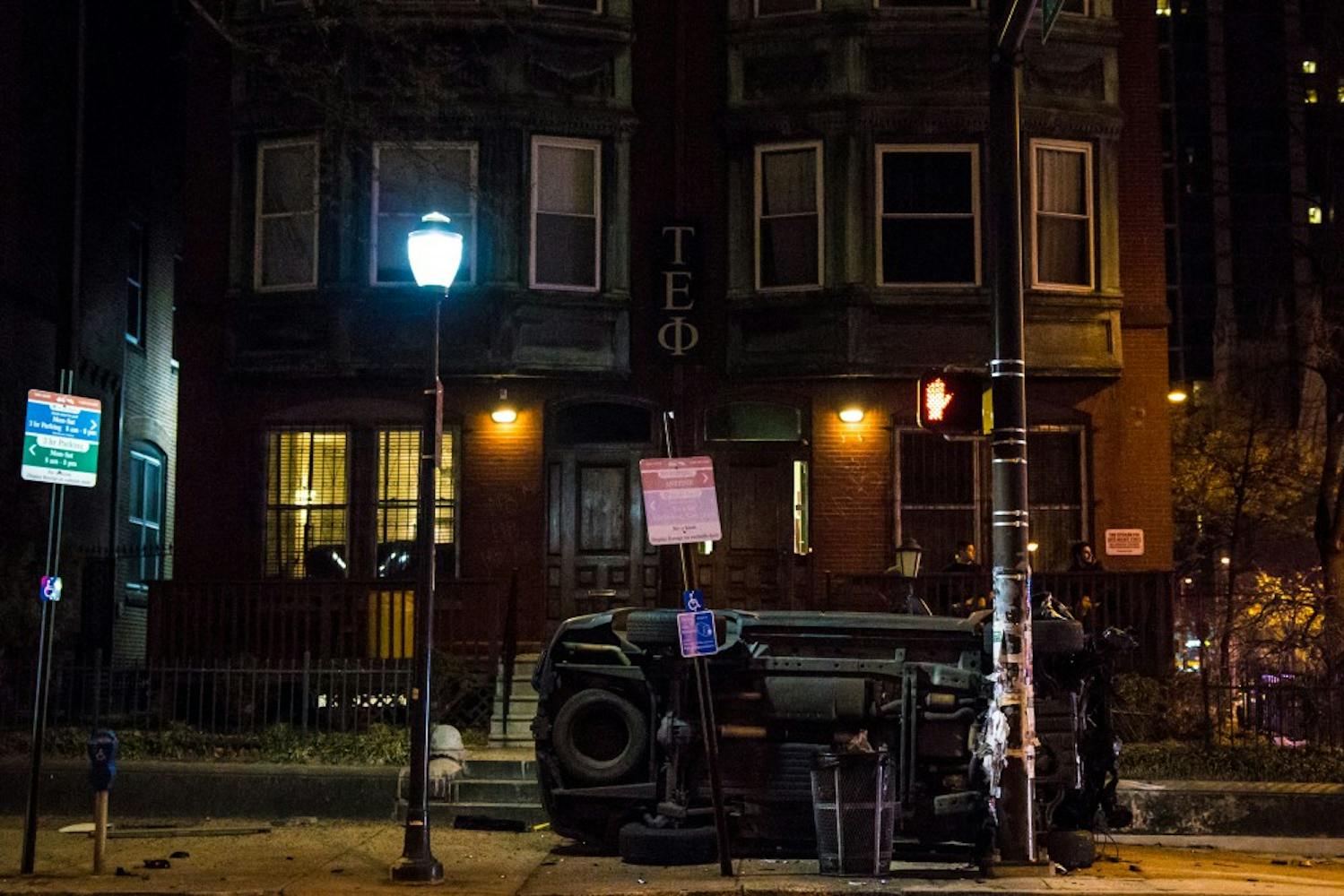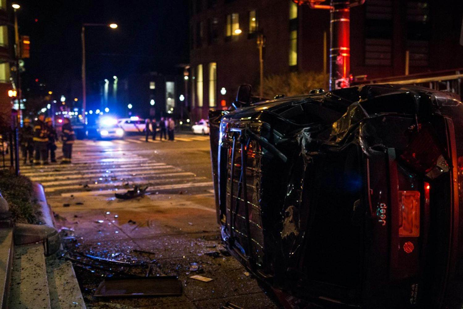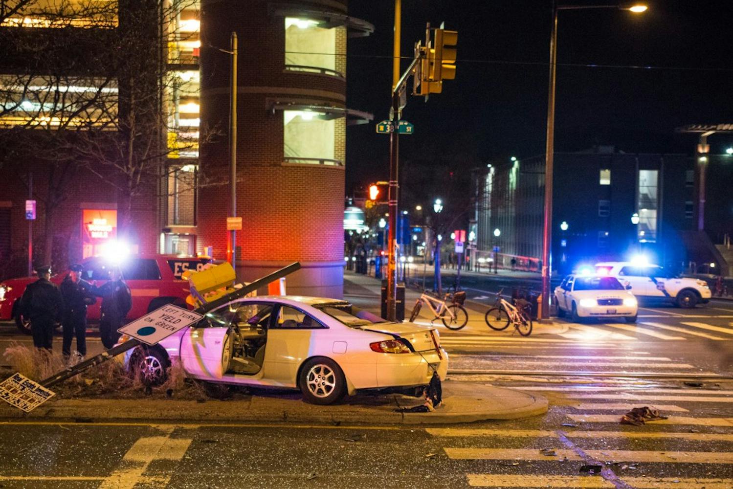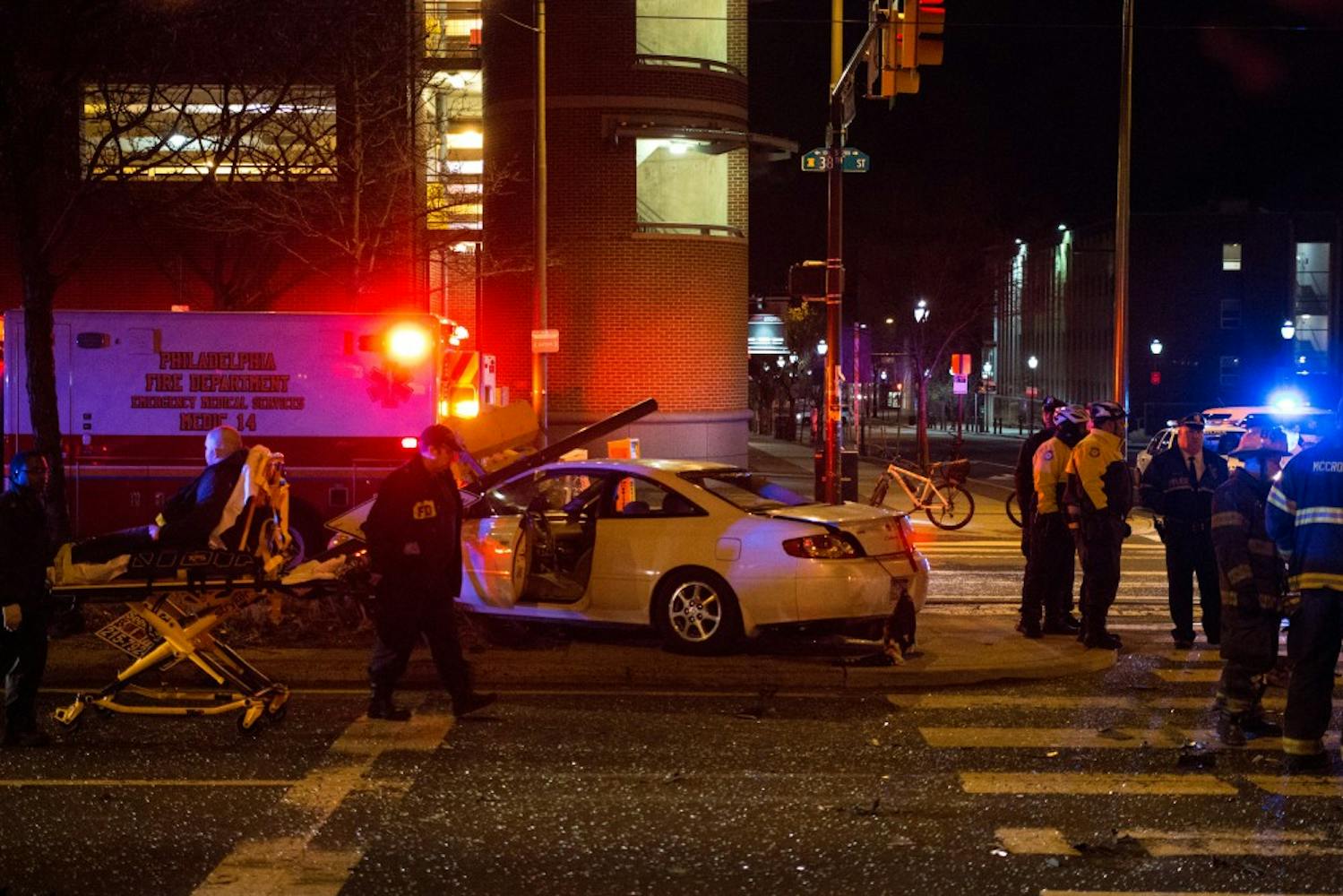 At approximately 3:50 a.m. a black Laredo Jeep speeding down Walnut Street collided with a white Toyota Solara at the intersection of 38th and Walnut, according to police and bystanders at the scene. Debris and glass littered the intersection, with police arriving on the scene shortly after the crash. The black Jeep was traveling at least 65 miles per hour and had sped past three red traffic lights before crashing with the Toyota, said taxi driver Mohammad Ali, who witnessed the event.