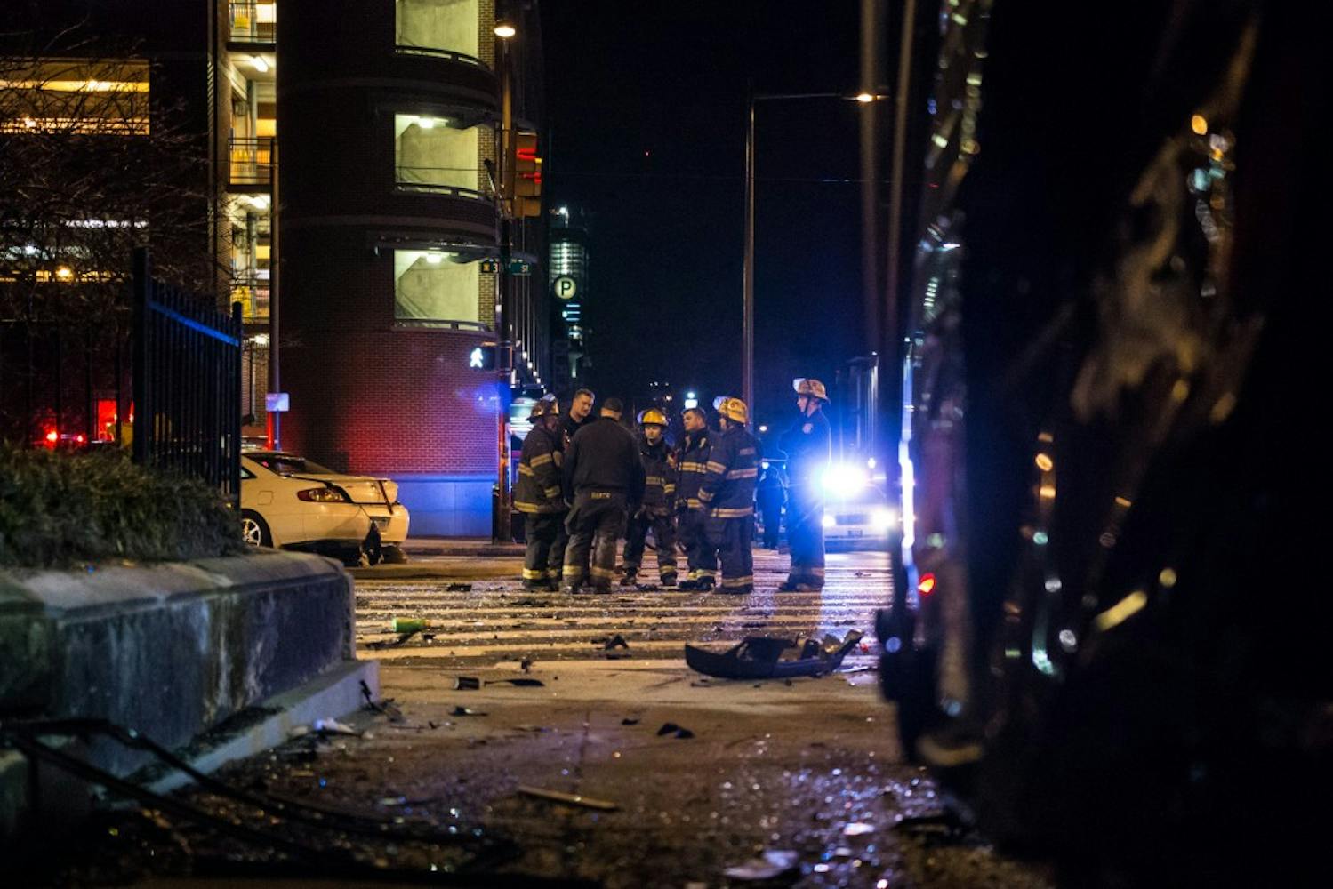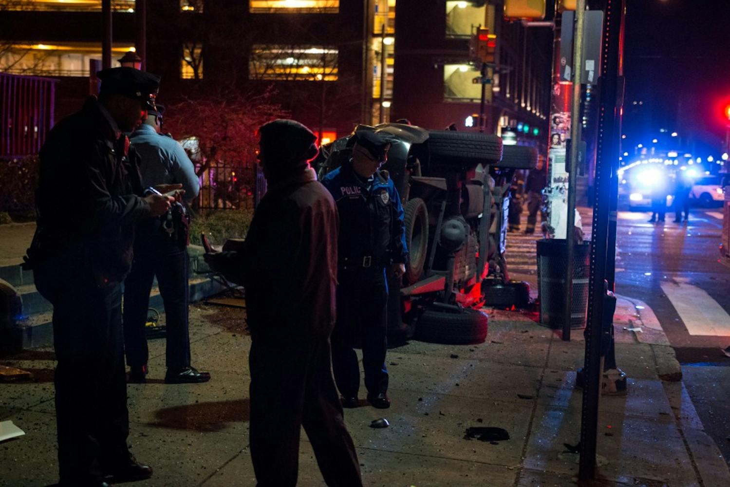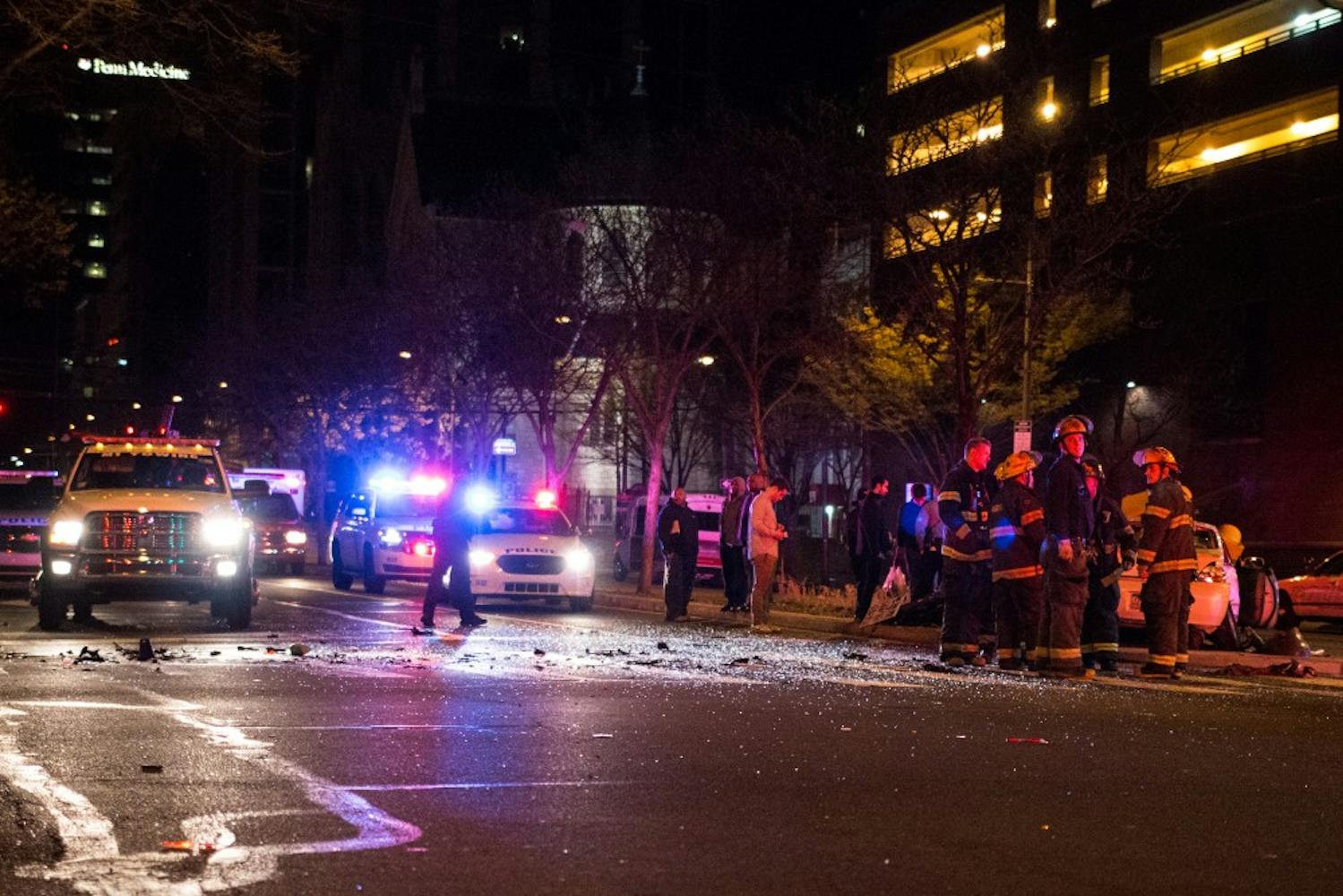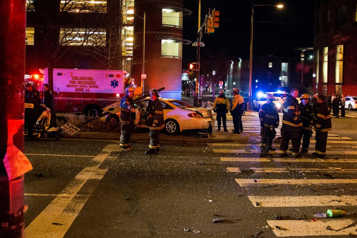 At approximately 3:50 a.m. a black Laredo Jeep speeding down Walnut Street collided with a white Toyota Solara at the intersection of 38th and Walnut, according to police and bystanders at the scene. Debris and glass littered the intersection, with police arriving on the scene shortly after the crash. The black Jeep was traveling at least 65 miles per hour and had sped past three red traffic lights before crashing with the Toyota, said taxi driver Mohammad Ali, who witnessed the event.