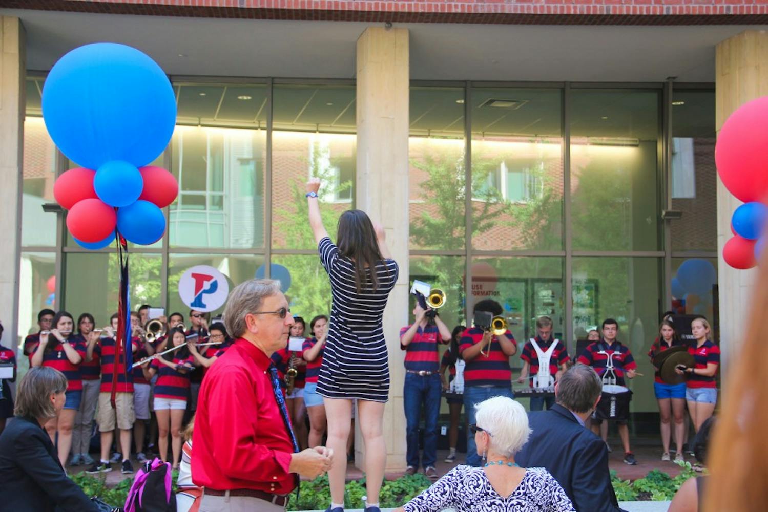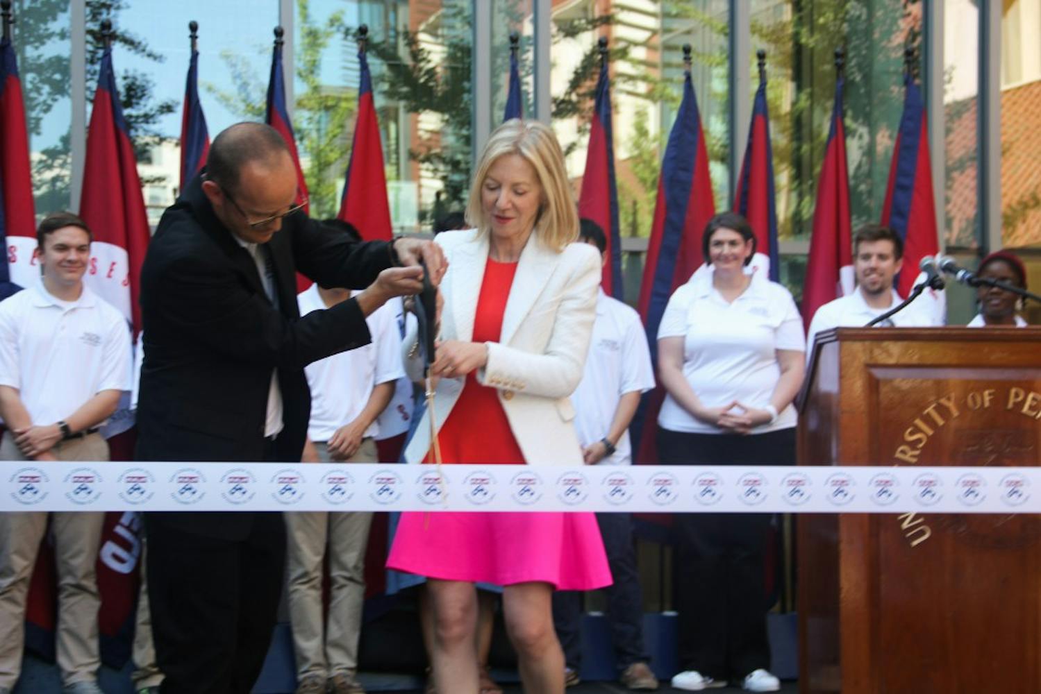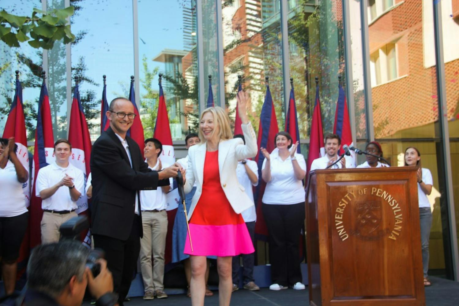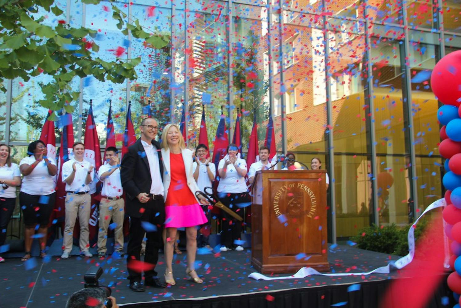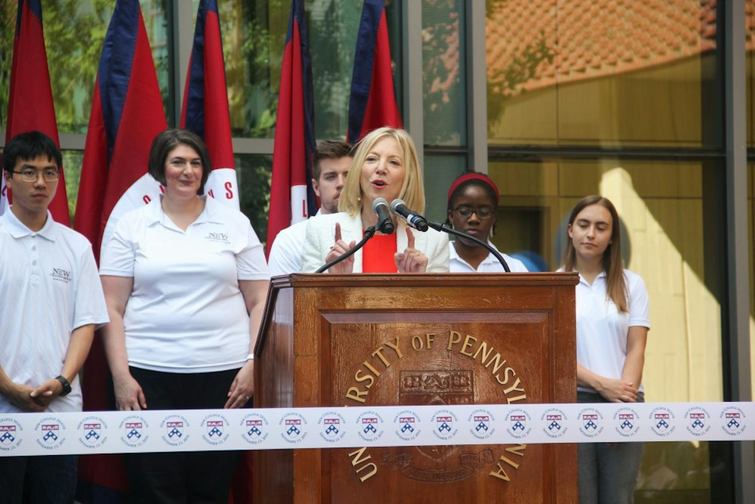 On Tuesday afternoon, University President Amy Gutmann cut the ceremonial ribbon to New College House. This isn't President Gutmann's first ceremonial visit to New College House. During Freshman Move-In, she visited to speak with incoming students. The Penn Band was present to add pomp to the event.
