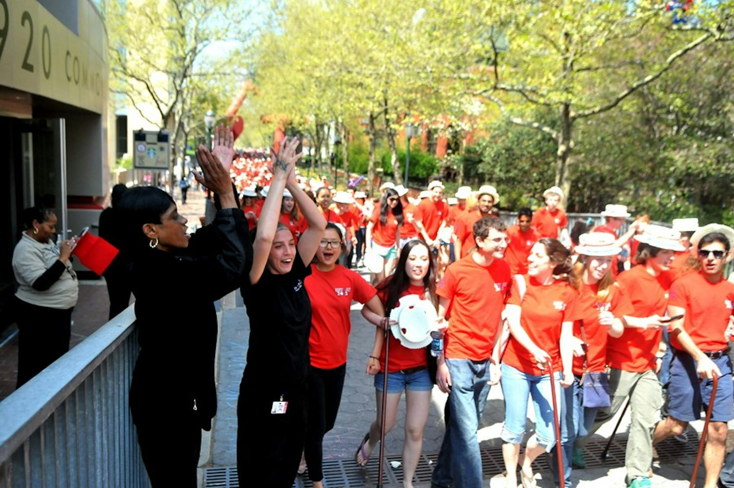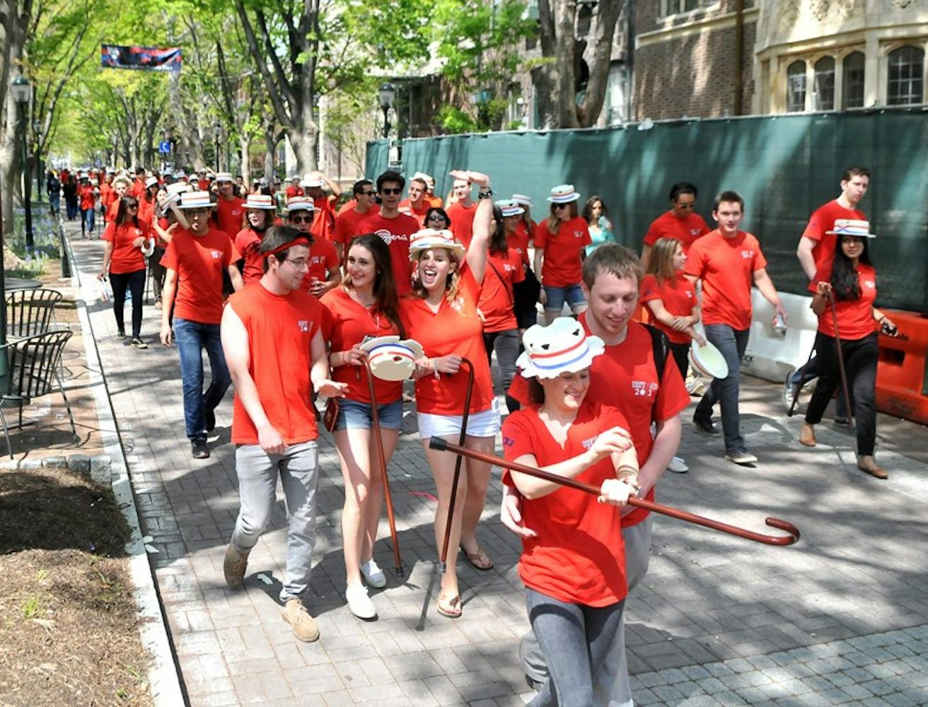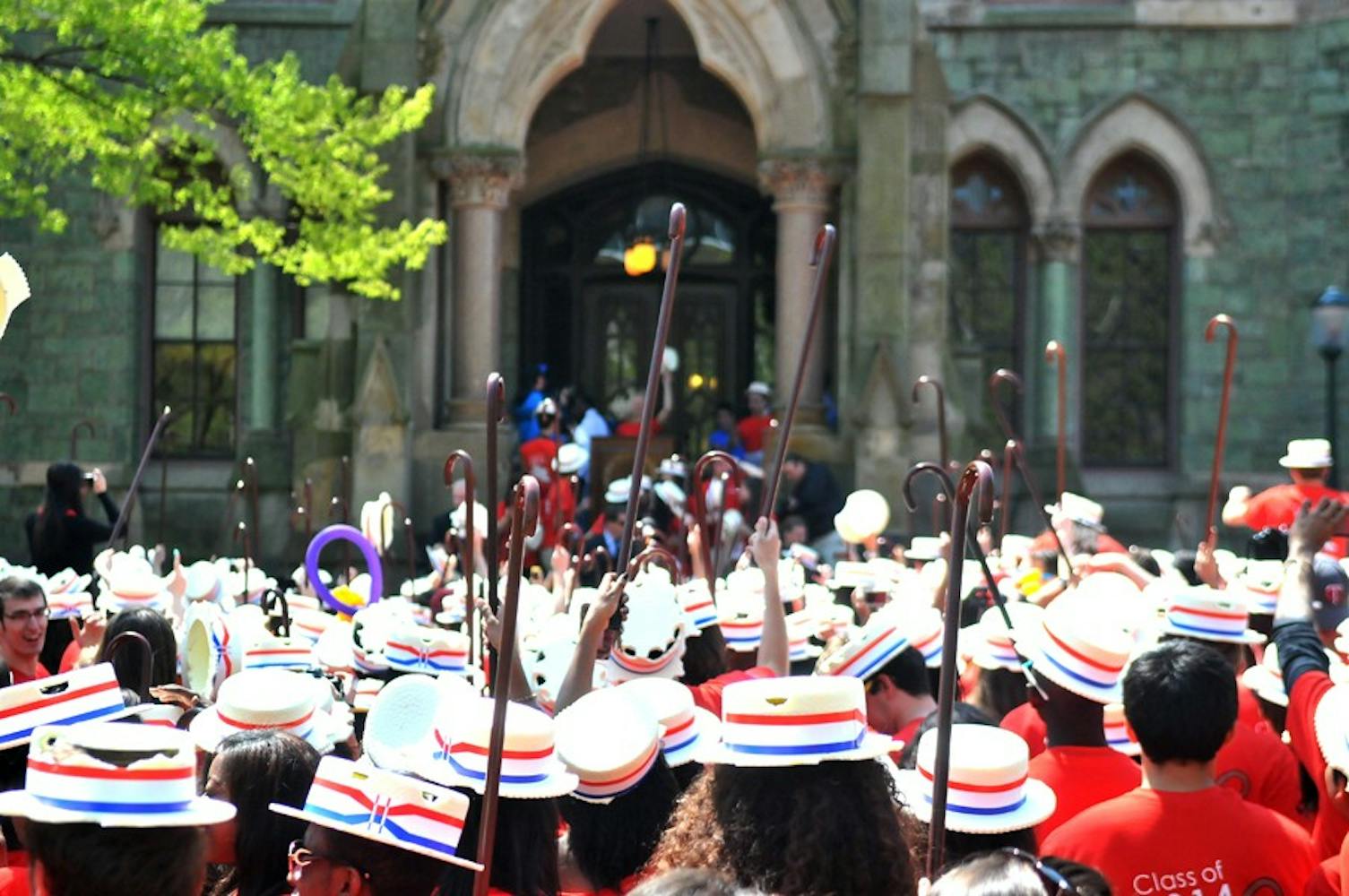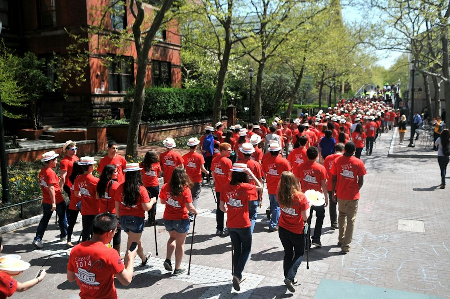 The Class of 2014 don Penn’s traditional red shirts, canes and straw hats for a walk down Locust to College Hall in celebration of Hey Day 2013, a celebration that marks the ‘moving up’ of juniors to seniors at Penn.