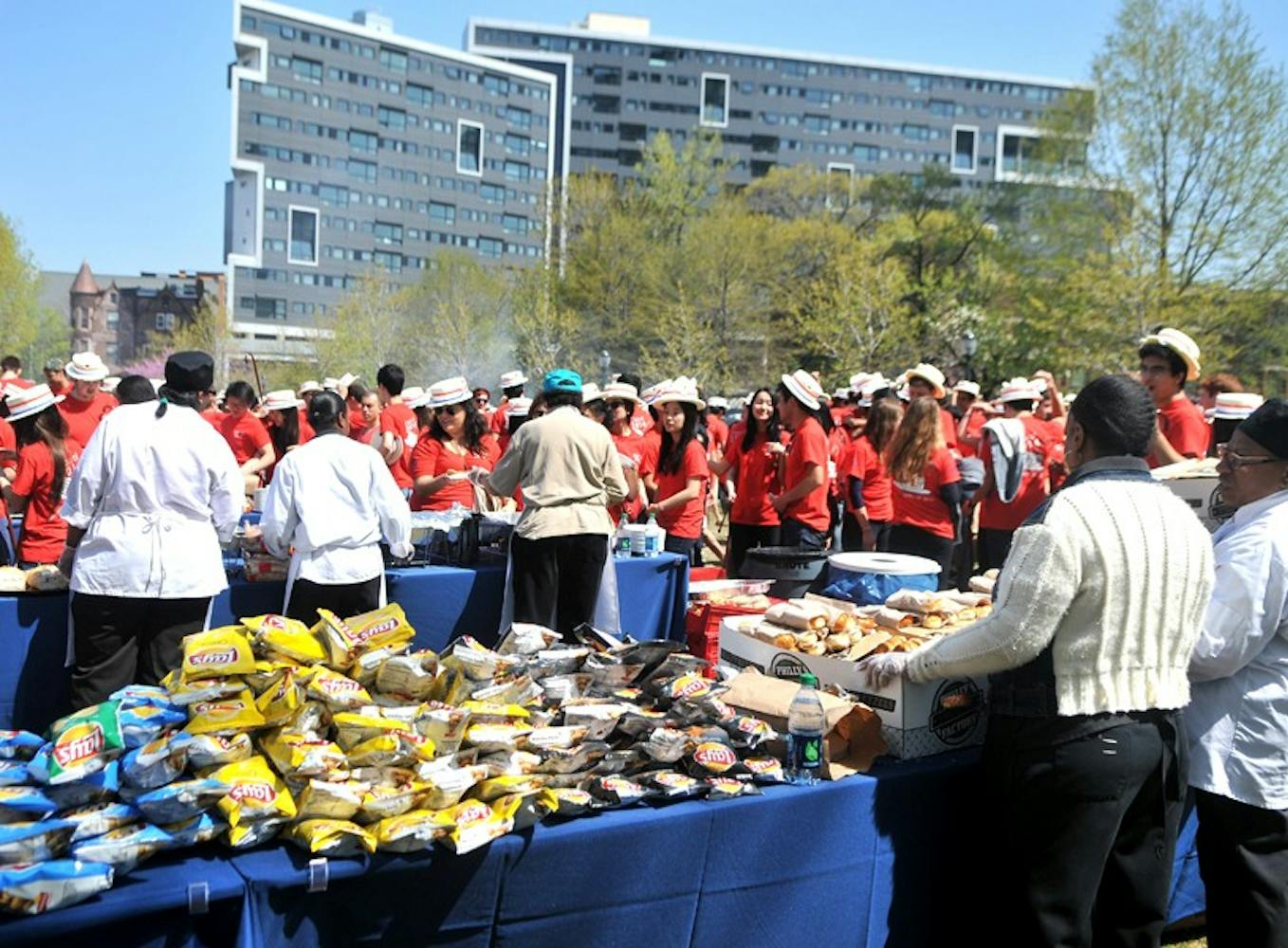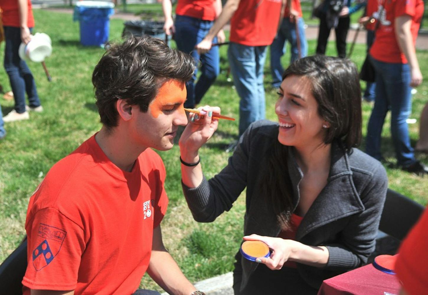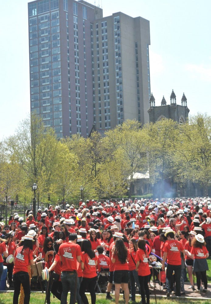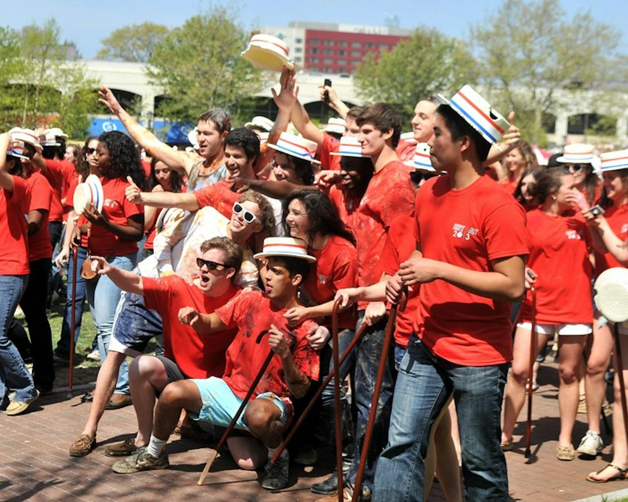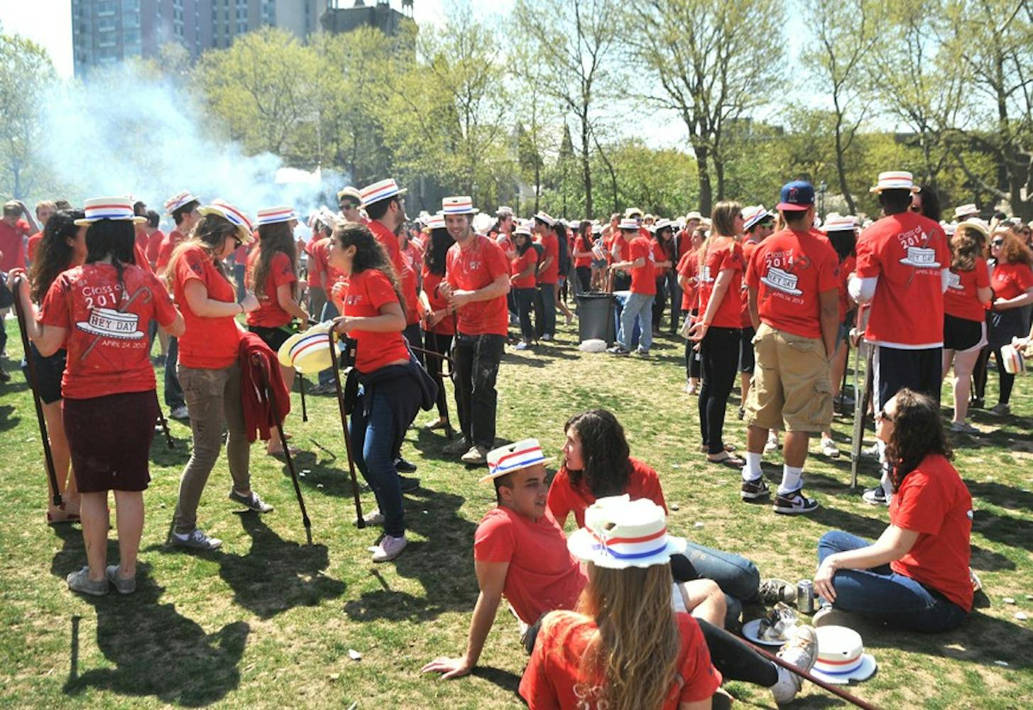 The Class of 2014 don Penn’s traditional red shirts, canes and straw hats for a walk down Locust to College Hall in celebration of Hey Day 2013, a celebration that marks the ‘moving up’ of juniors to seniors at Penn.