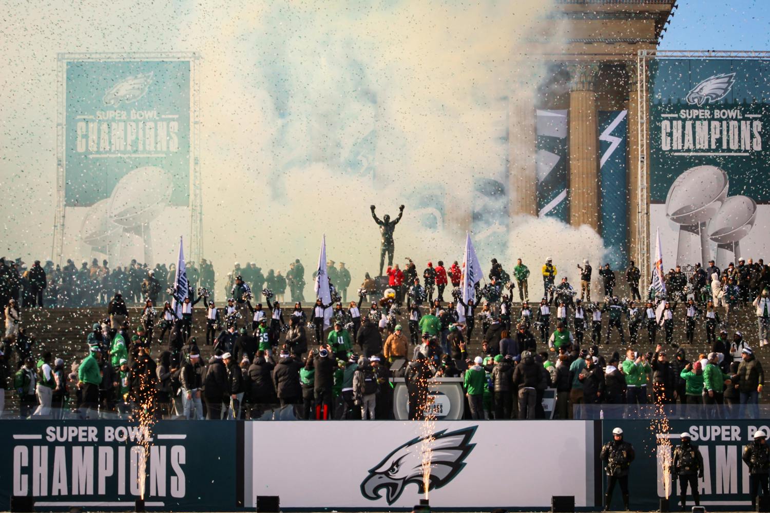 Pyrotechnics and confetti go off as the Eagles arrive at the Philadelphia Museum of Art during the victory parade on Feb. 14.