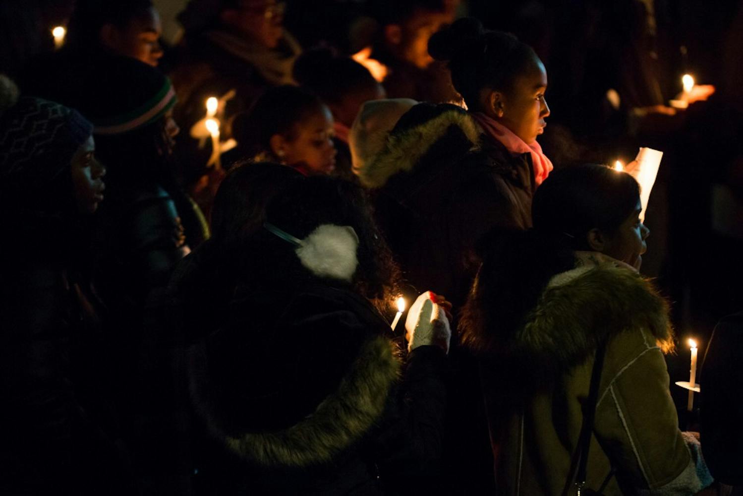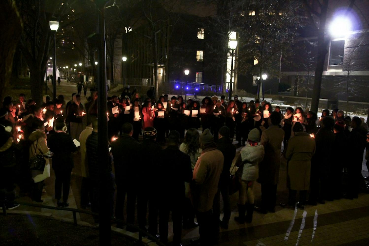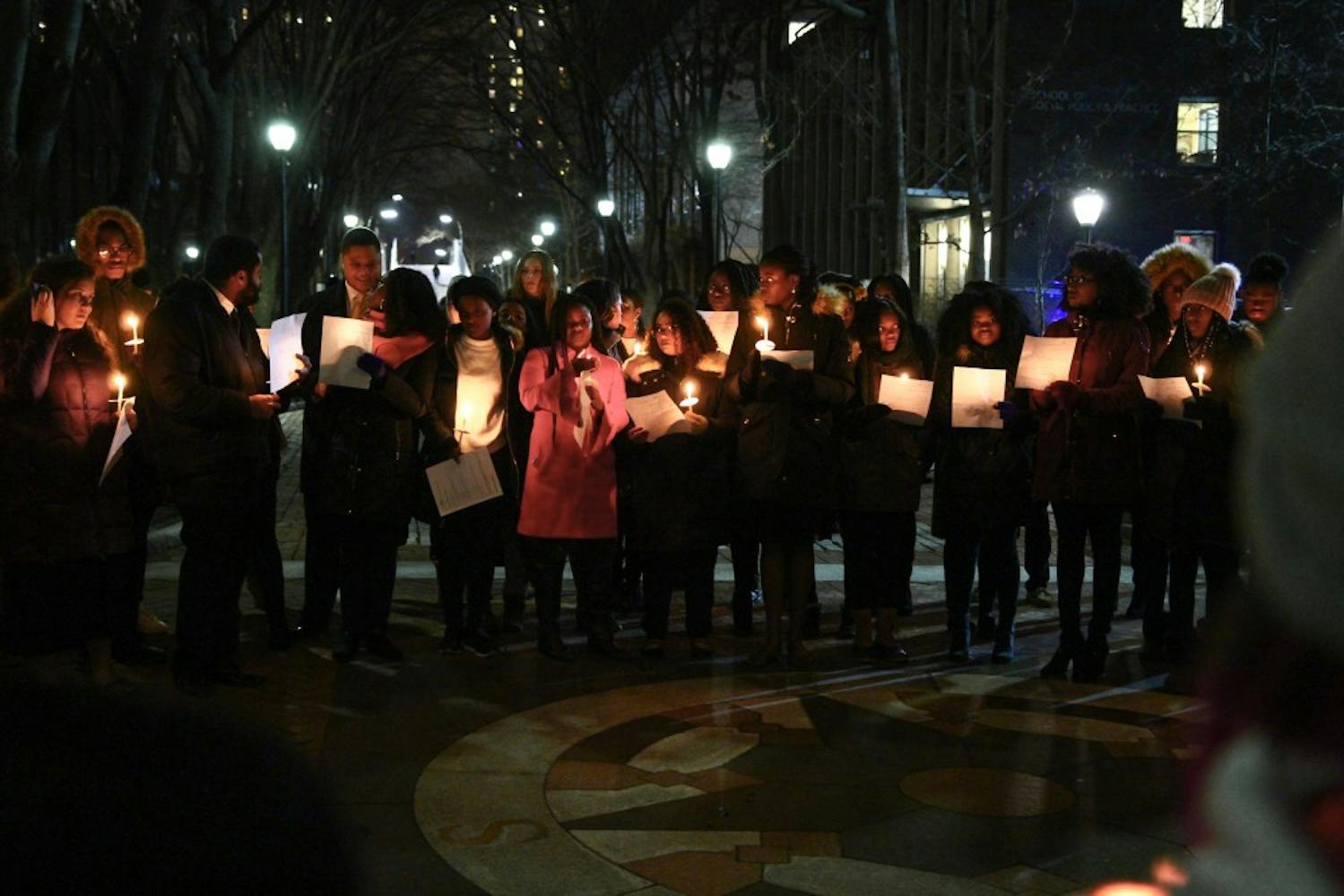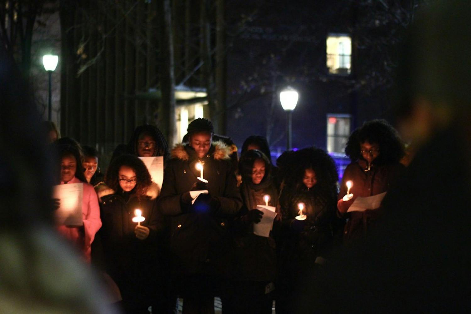 To cap off a day of service in honor of Martin Luther King Jr., residents of W.E.B. Du Bois College House and members of the community at large precessed in silence from Du Bois to the compass, where they held a candlelight vigil organized by the Alpha Kappa Alpha sorority and Alpha Phi Alpha fraternity. Following the lighting of the candles, the congregation sang "Lift Every Voice and Sing," held a prayer, and returned to Du Bois, where commemorations continued until 10 p.m. (Photos by Julio Sosa and Lulu Wang)