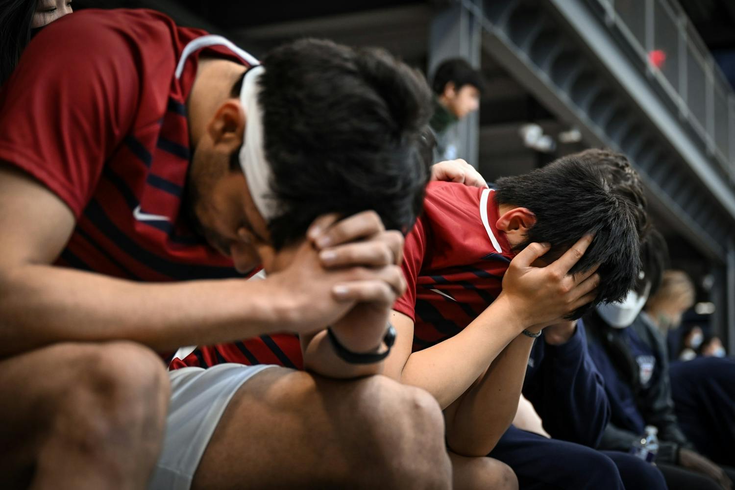 Juniors Saksham Choudhary (left) and Dillon Huang (right) react to Penn men's squash's loss to Harvard in the College Squash Association National Team Championships Final at the Penn Squash Center on Feb. 20.