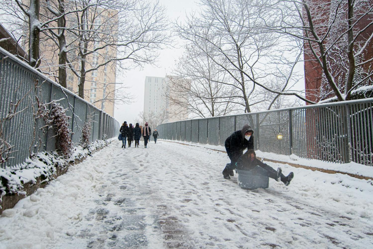 Students sled down Locust Bridge on Feb. 1.