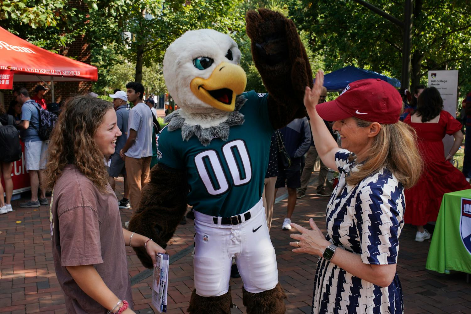 Penn President Liz Magill and Swoop, the Philadelphia Eagles' mascot, greet a new student to campus during first-year move in on Aug. 22.