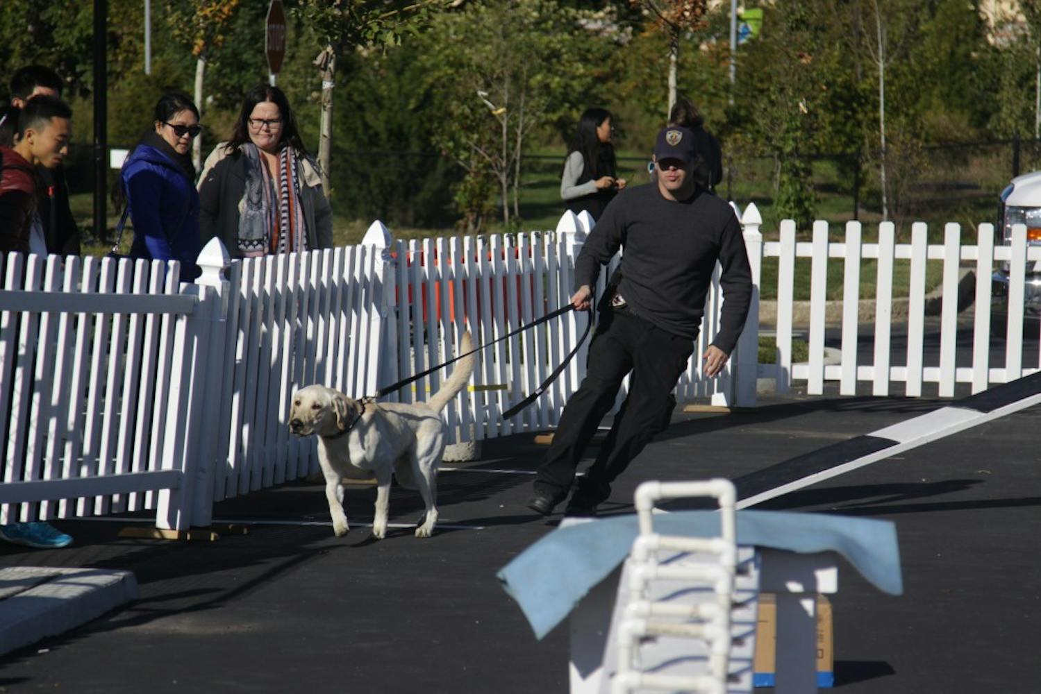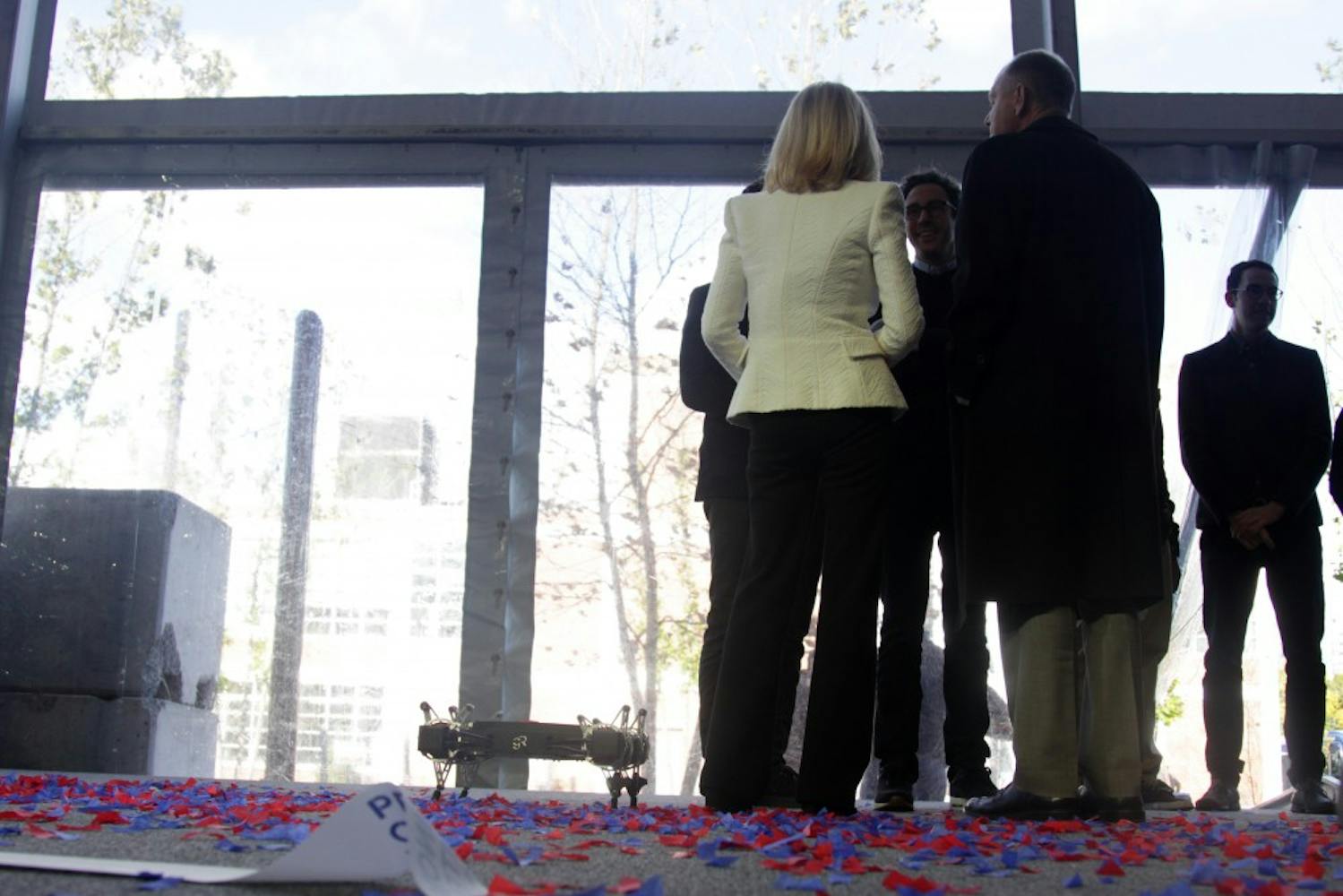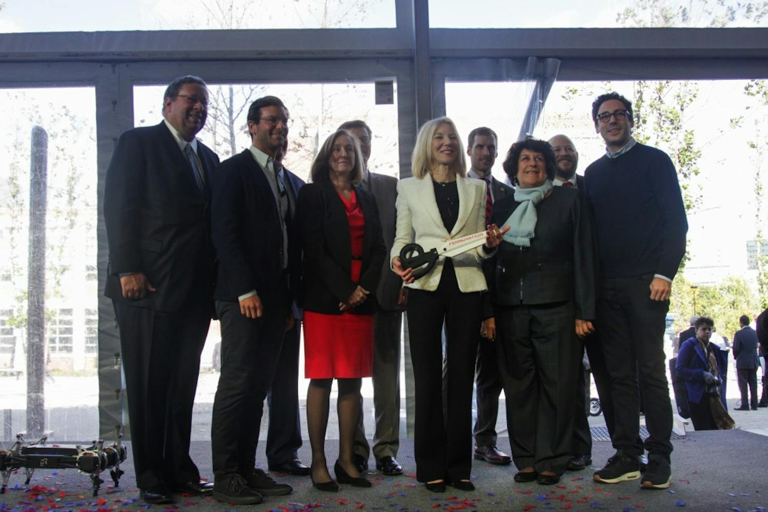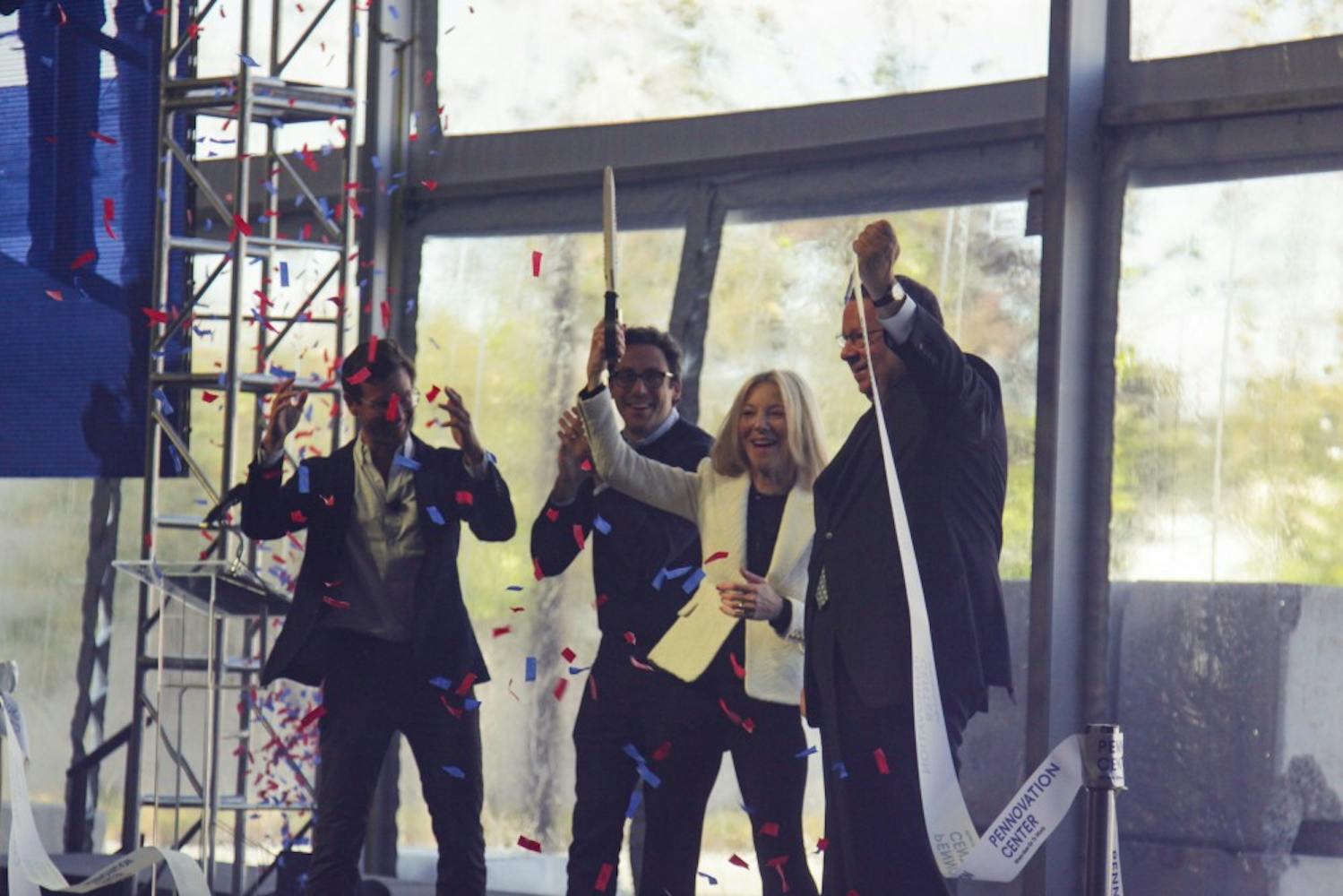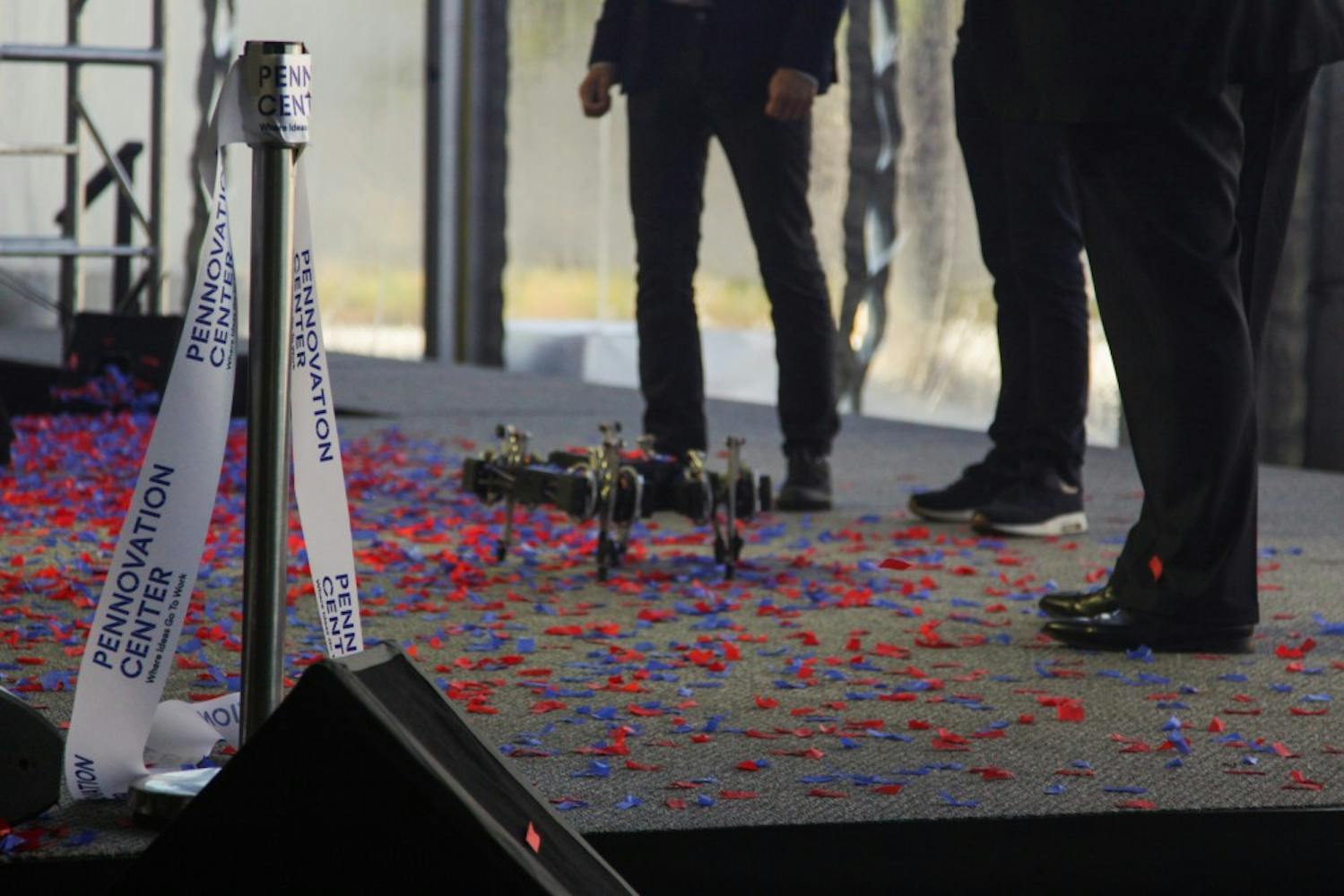 On Friday, October 28, the Pennovation Center had its grand opening. The ceremony included speeches by CEO of Cognitive Operational Systems LLC (COSY) Jonas Cleveland, and the CEO of Qualcomm Technologies, Inc., Engineer Daniel Mellinger. In addition to University President Amy Gutmann, the keynote address featured Neil Blumenthal and Dave Gilboa, Co-Founders and Co-CEO's of Warby Parker, who both graduated from the Wharton MBA program in 2010, as well as Board Chair David L. Cohen. When the time came, the Ghost Minitaur™, a robot of Ghost Robotics, joined Gutmann on stage and brought her the scissors for the ribbon cutting. After the keynote presentation, there were self-guided tours of the Center and a networking session featuring Cynthia Otto of Penn Vet Working Dog Center, accompanied by her human and canine team.