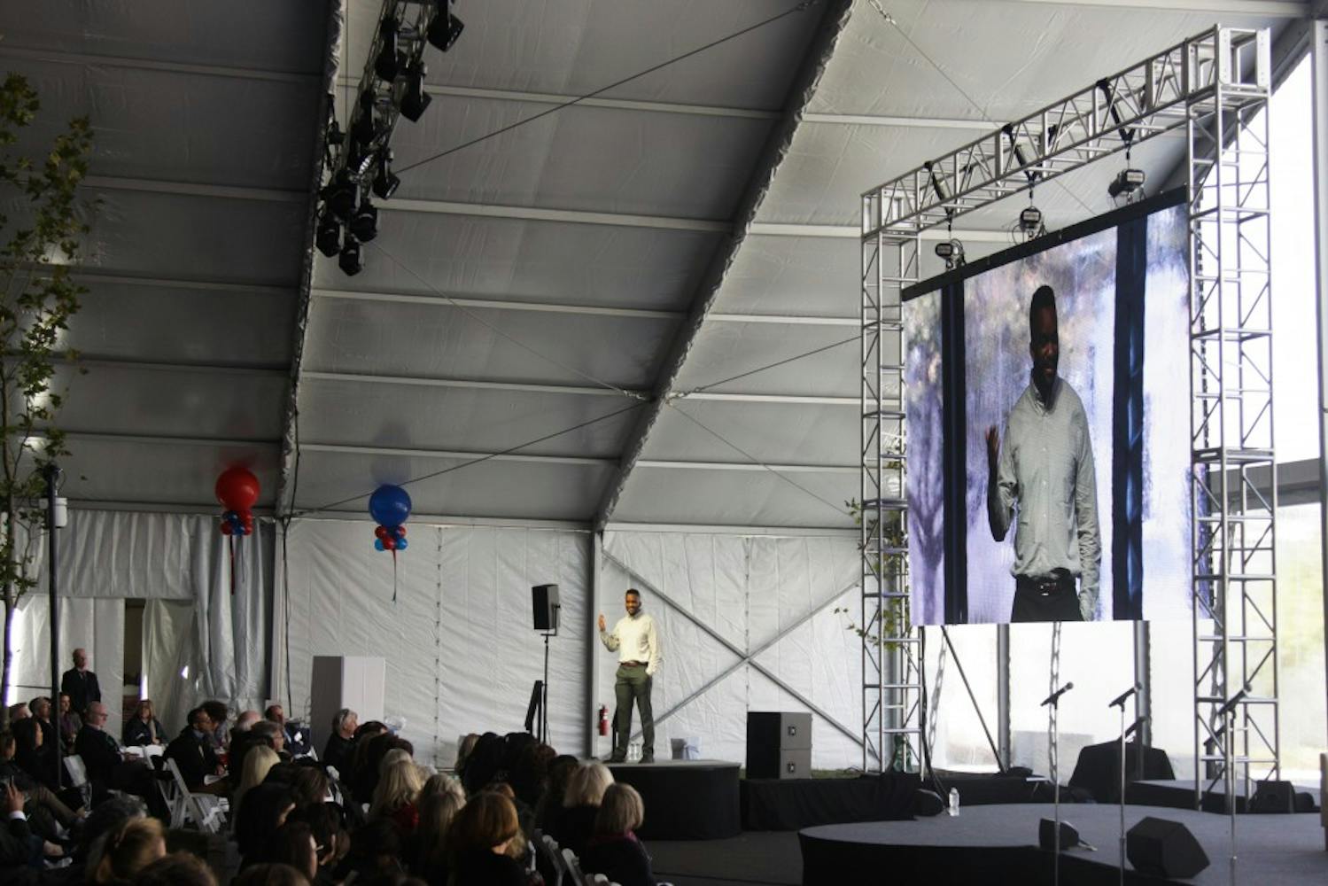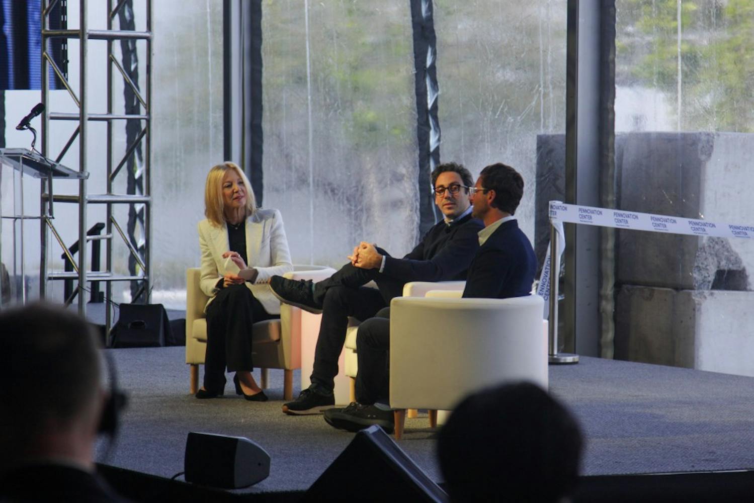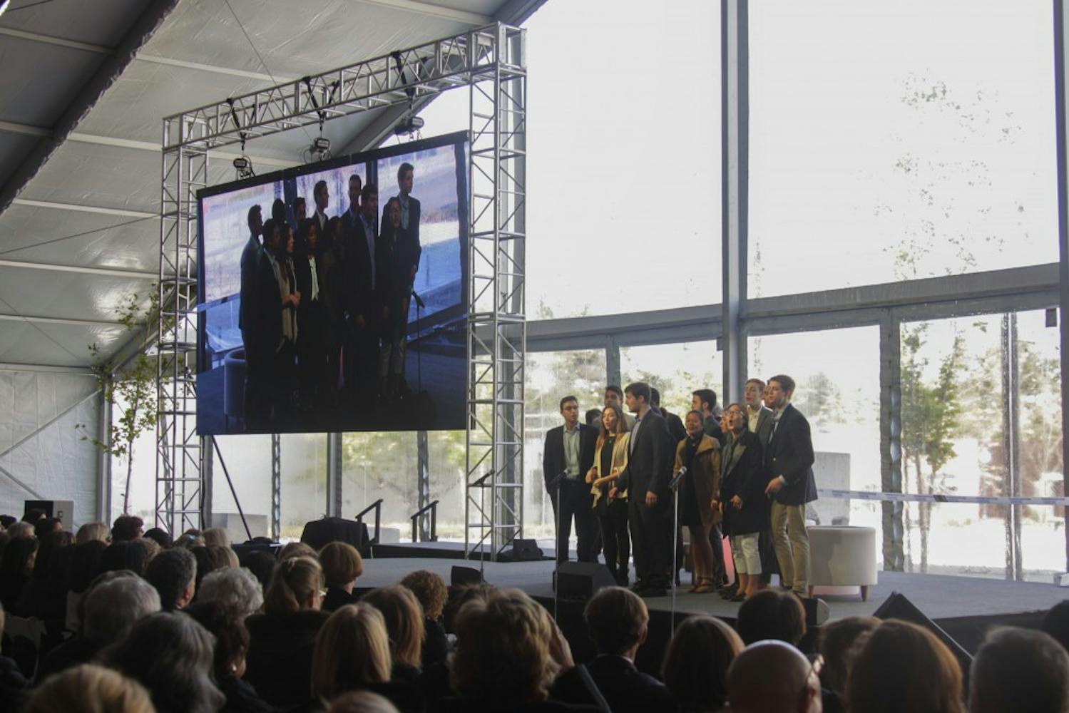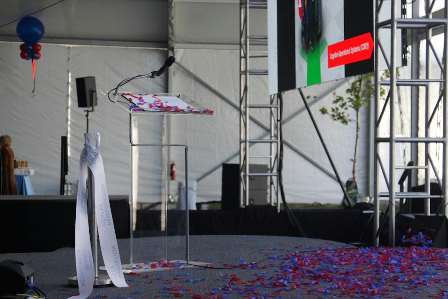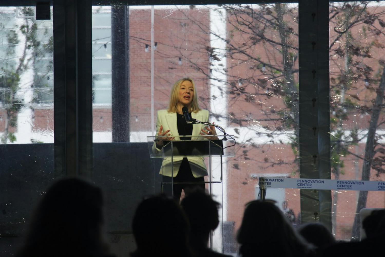 On Friday, October 28, the Pennovation Center had its grand opening. The ceremony included speeches by CEO of Cognitive Operational Systems LLC (COSY) Jonas Cleveland, and the CEO of Qualcomm Technologies, Inc., Engineer Daniel Mellinger. In addition to University President Amy Gutmann, the keynote address featured Neil Blumenthal and Dave Gilboa, Co-Founders and Co-CEO's of Warby Parker, who both graduated from the Wharton MBA program in 2010, as well as Board Chair David L. Cohen. When the time came, the Ghost Minitaur™, a robot of Ghost Robotics, joined Gutmann on stage and brought her the scissors for the ribbon cutting. After the keynote presentation, there were self-guided tours of the Center and a networking session featuring Cynthia Otto of Penn Vet Working Dog Center, accompanied by her human and canine team.
