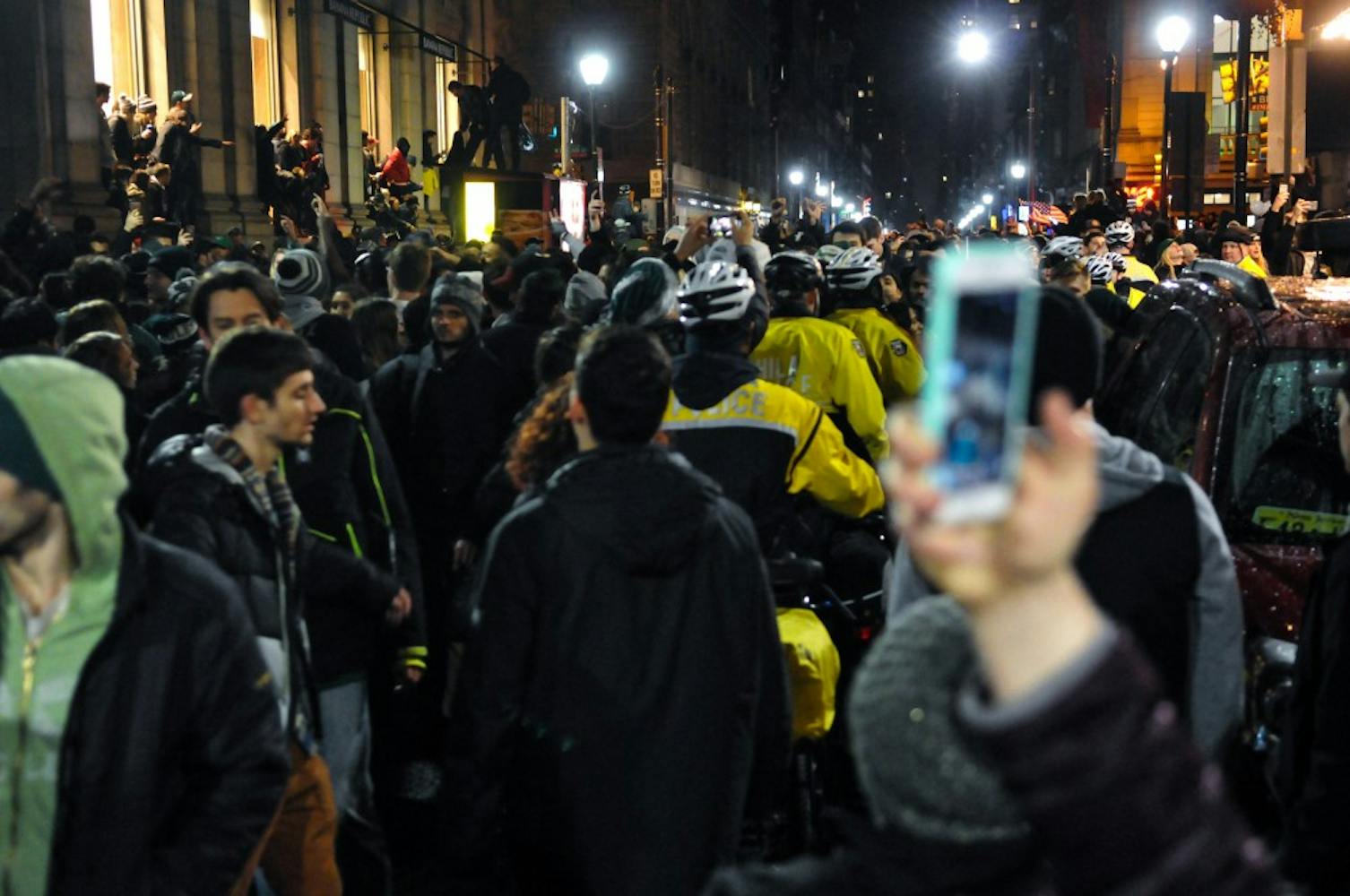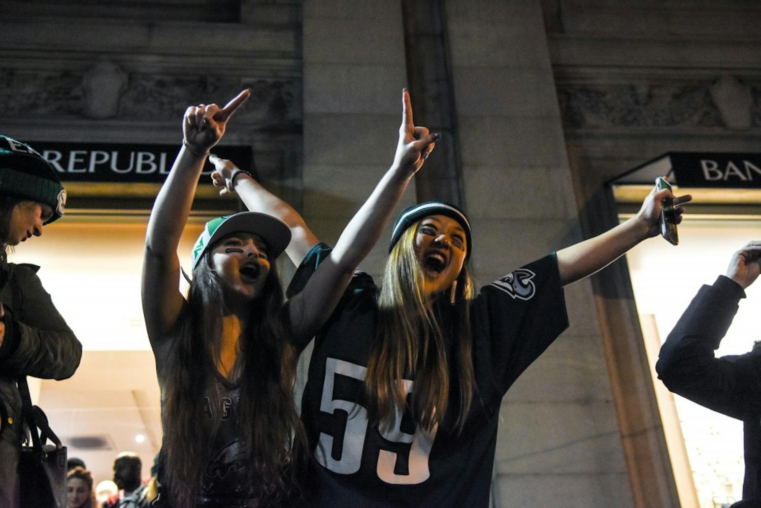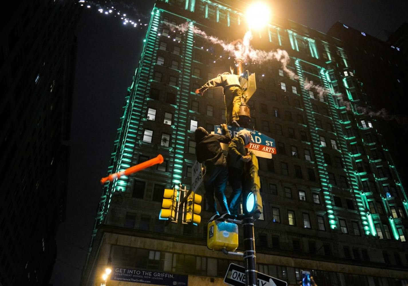 Following the Eagles' Super Bowl victory Sunday night, Center City transformed into a sea of chaos as residents of Philadelphia stormed the streets in celebration. People danced on cars, honked their horns, climbed up lampposts, launched fireworks, and screamed "Go Birds!" It was the Eagles' first Super Bowl victory ever. Photos by Sam Holland, Joy Lee, Zach Sheldon, Carson Kahoe, Mona Lee, Julio Sosa, and Pranay Vemulamada.
