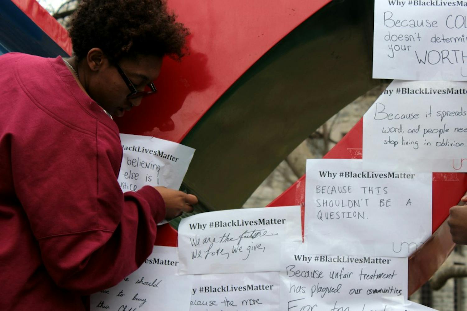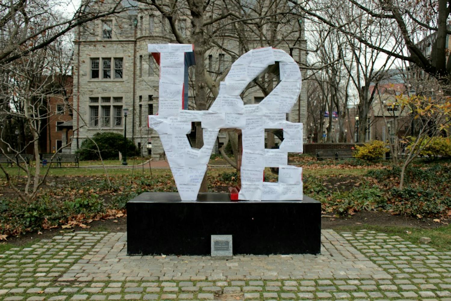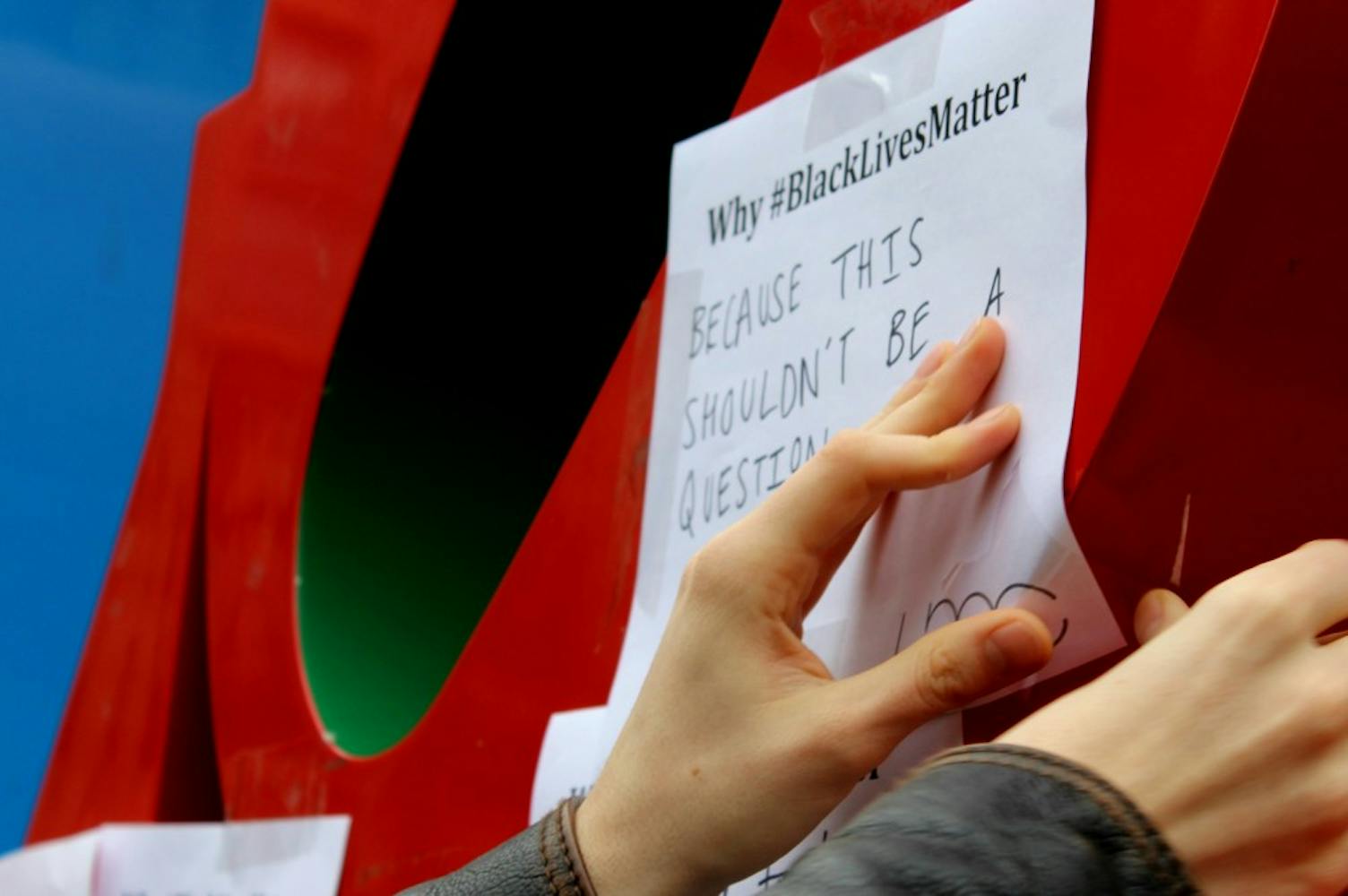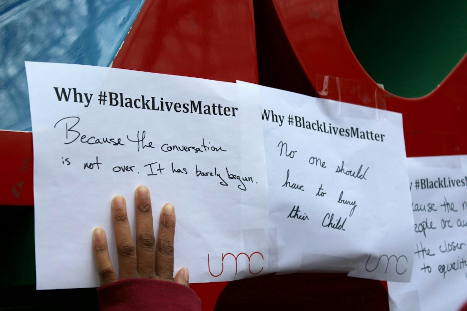 The United Minorities Council asked students earlier this week to write their reasons for why #BlackLivesMatter. Members then covered the LOVE statue with over 120 of these student responses.
