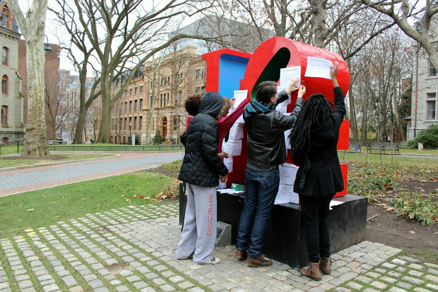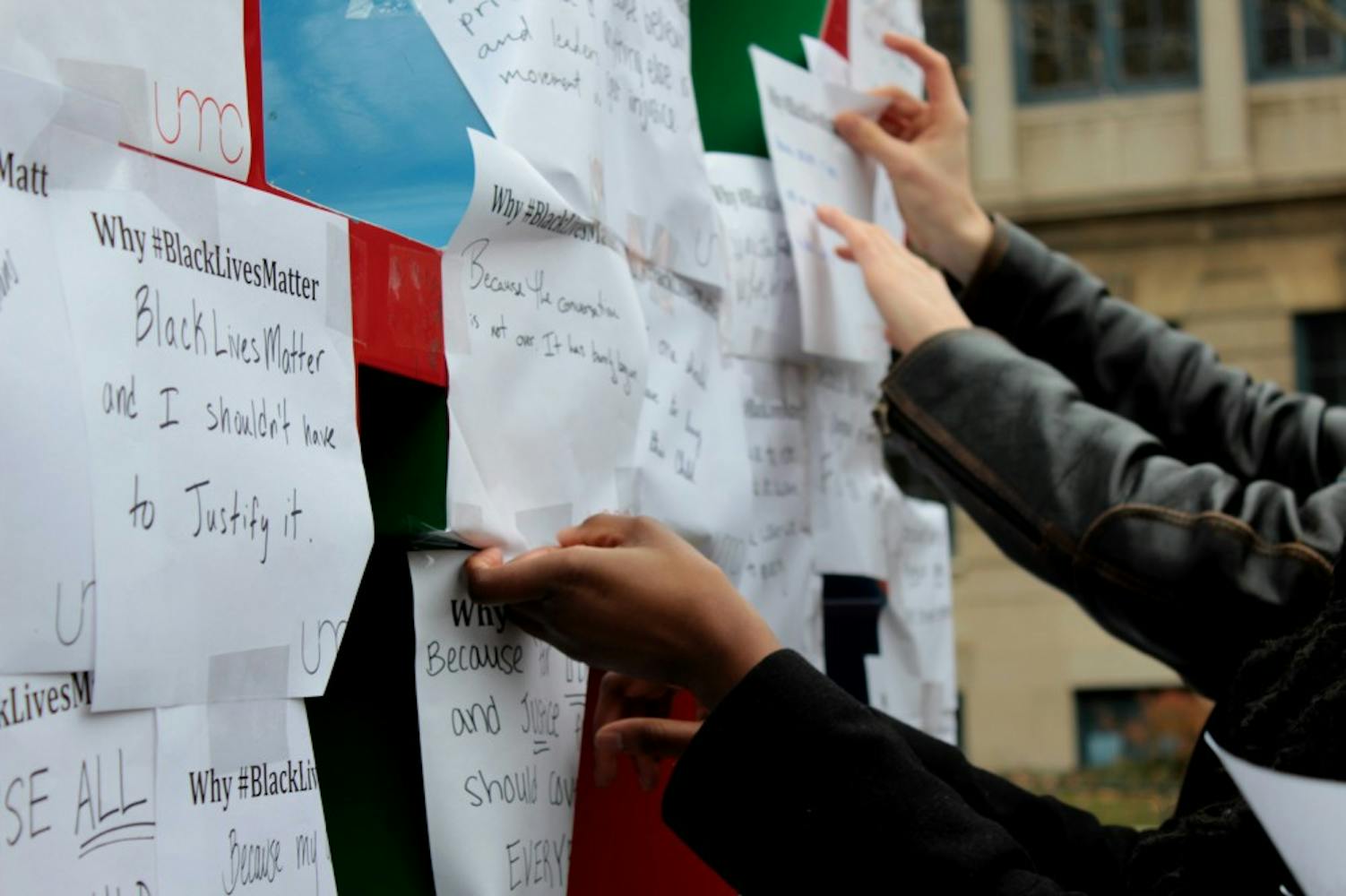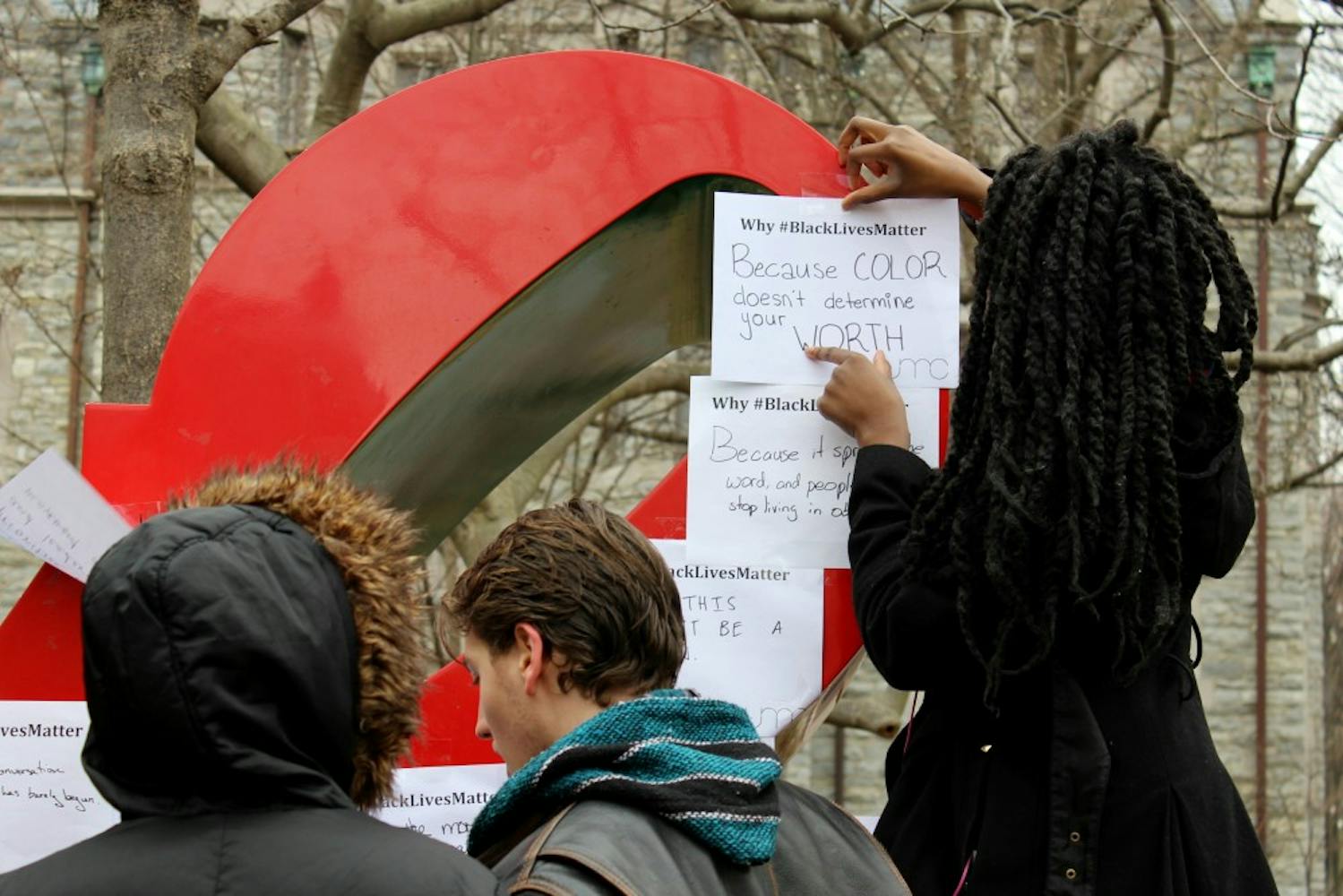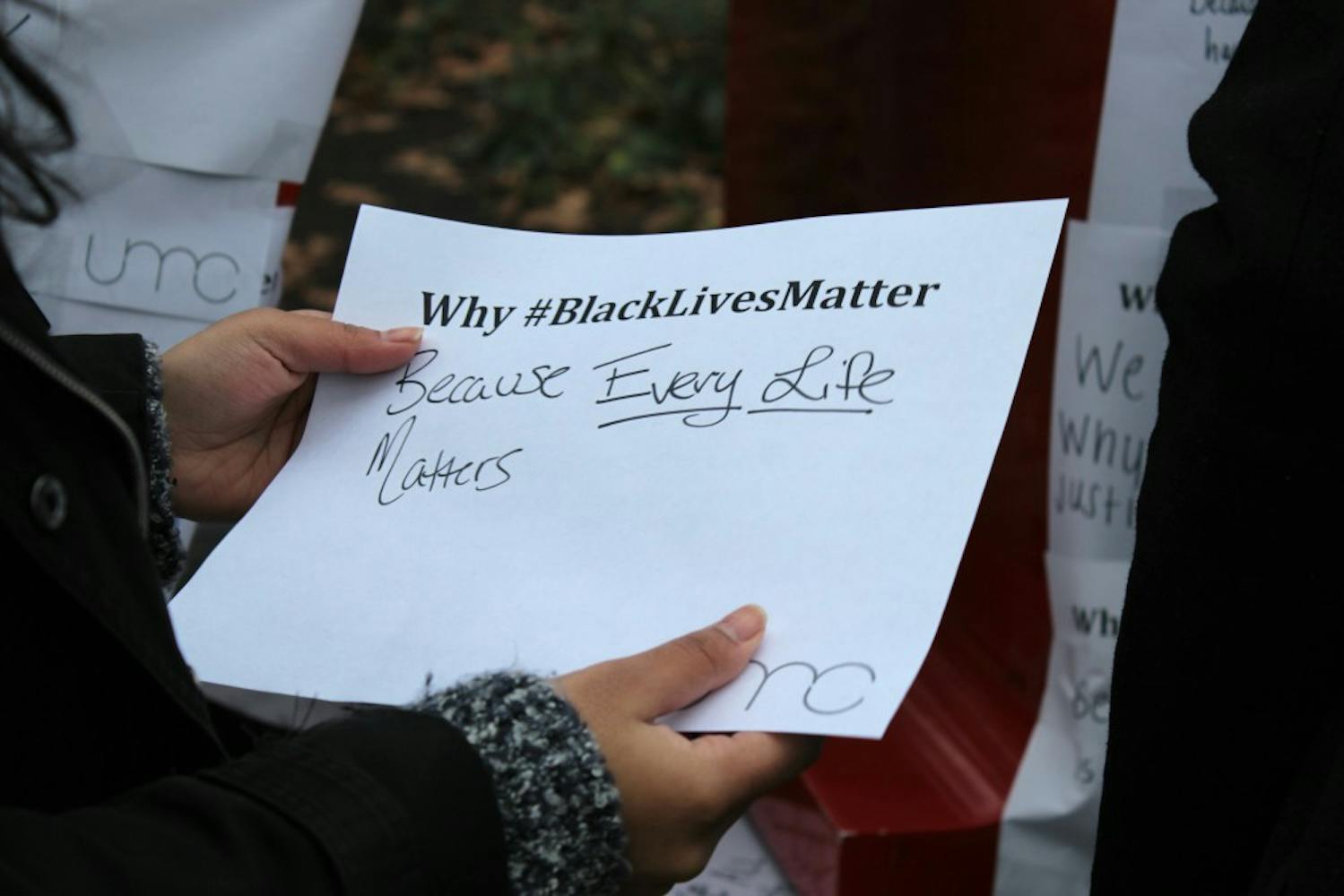 The United Minorities Council asked students earlier this week to write their reasons for why #BlackLivesMatter. Members then covered the LOVE statue with over 120 of these student responses.
