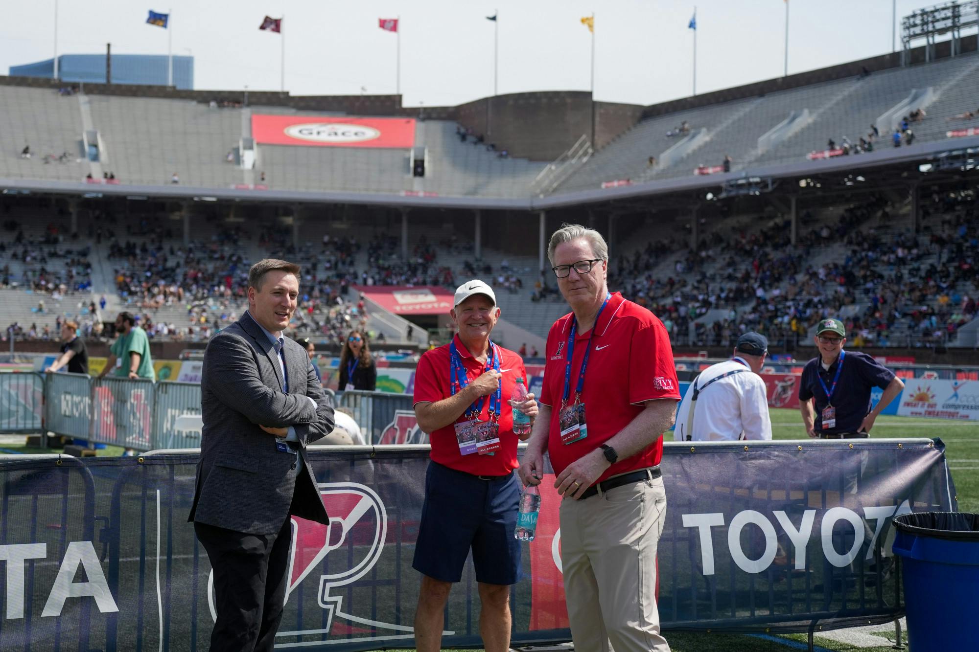 Former player for and current head coach of Penn men’s basketball Fran McCaffery took to the field for the Penn Relays moments ago.