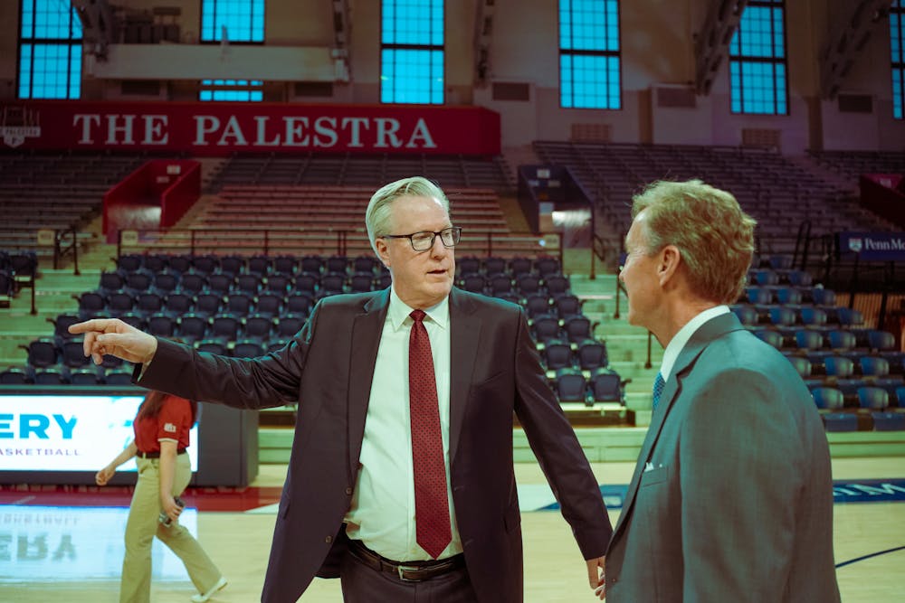 Penn men's basketball coach Fran McCaffrey points while talking to President Larry Jameson on Apr. 7.