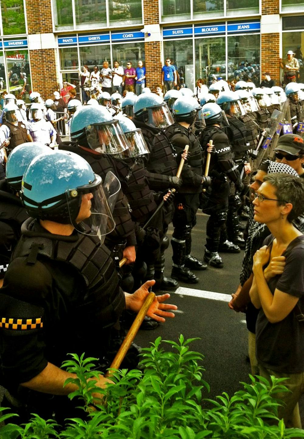 Protesters face a line of police in Chicago during the demonstrations against the NATO summit two weekends ago. Zachary Bell
