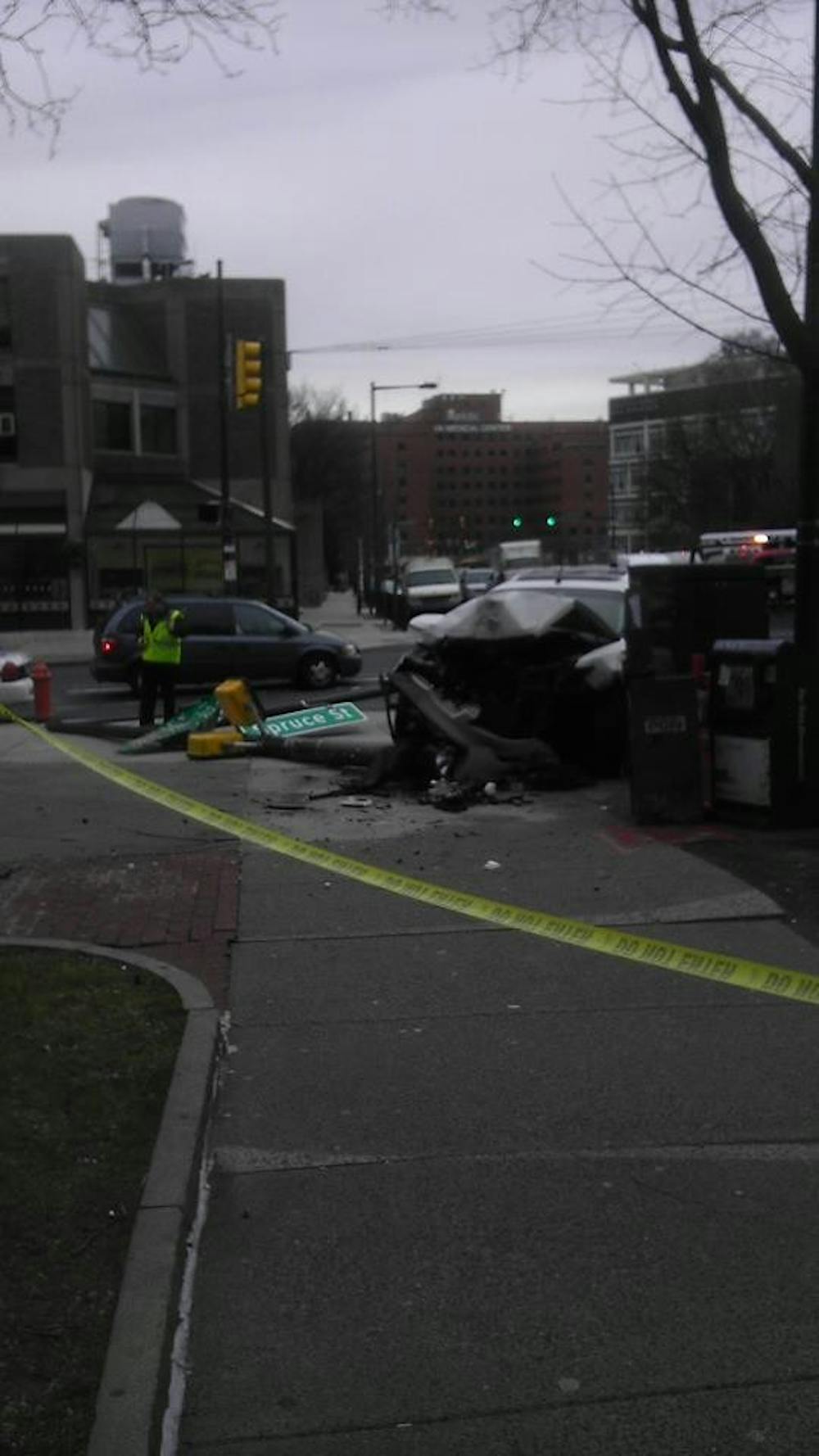 A car knocked down a street pole around the interaction of 38th and Spruce Friday afternoon. Huizhong Wu