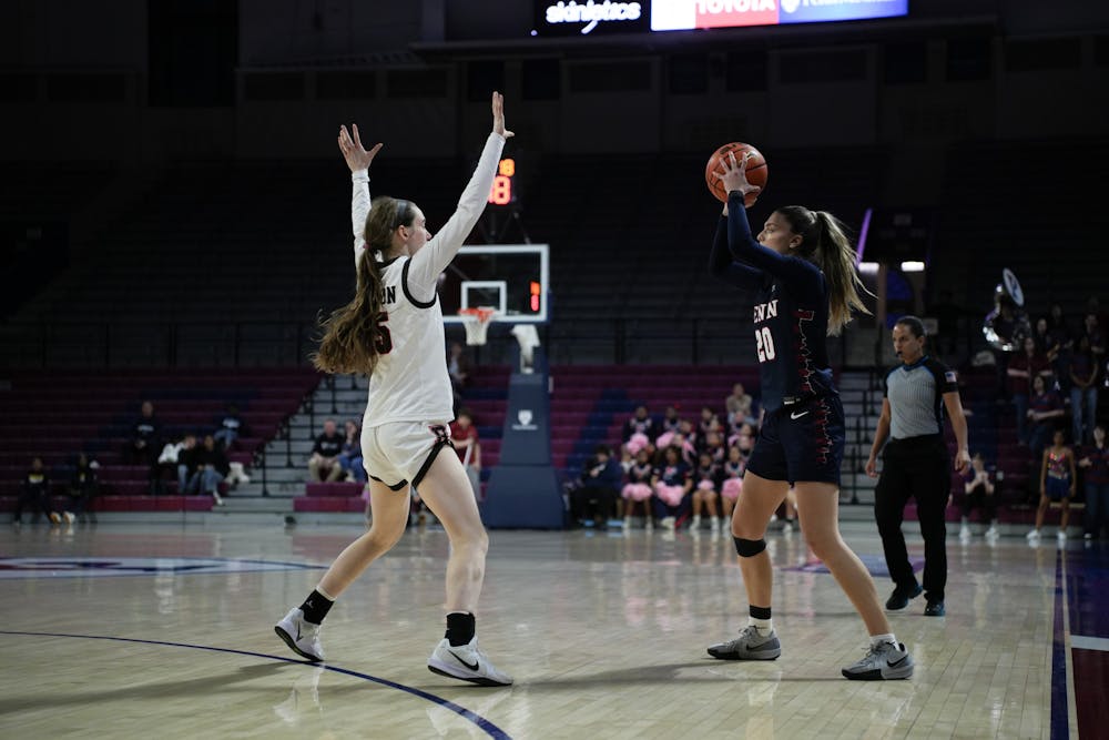 Then-sophomore guard Abby Sharpe looks for a pass on Feb. 15, 2025. Anjali Kishore