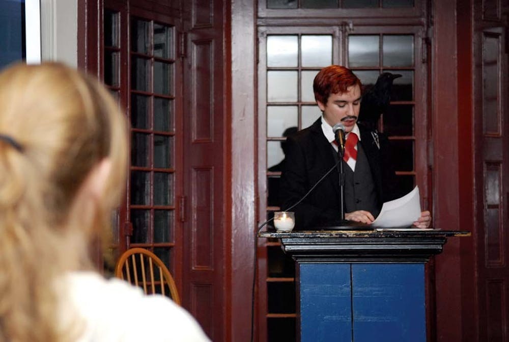 College junior Lee Hottner as Edgar Allen Poe recites some of Poe's famous work.