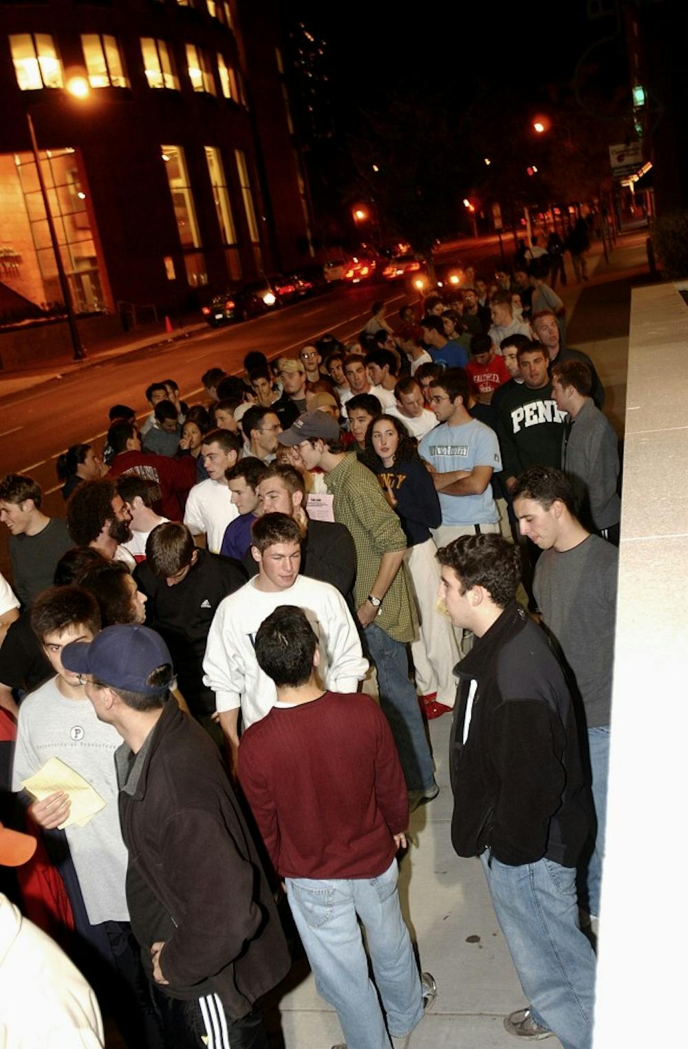Hundreds of Penn fans anxiously wait for an opportunity to receive bracelets to buy season basketball tickets. The location and time of the event wasn't announced until moments before the actual bracelets were given out.