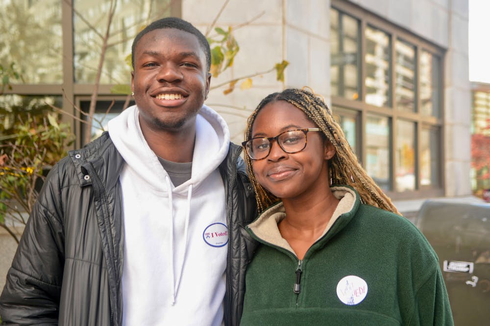 Engineering senior Michael Imeveore and Wharton senior Tami Owolabi wearing an "I Voted" sticker.