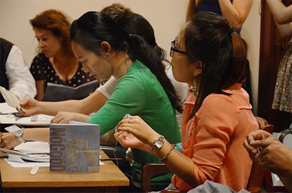 On Wednesday night, the Kelly Writer's House hosted a Bookbinding Workshop lead by Henry Steinberg,a 2013 College graduate. Participants learned the art of bookingbinding from Steinberg and his "No Good Guide to Basic Bookbinding" and left with four handmade books.