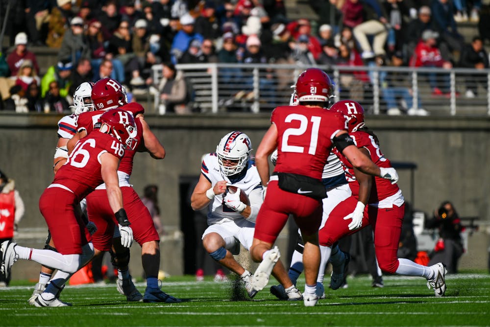 Senior quarterback Liam O'Brien attempts a rush against Harvard on Nov. 15.