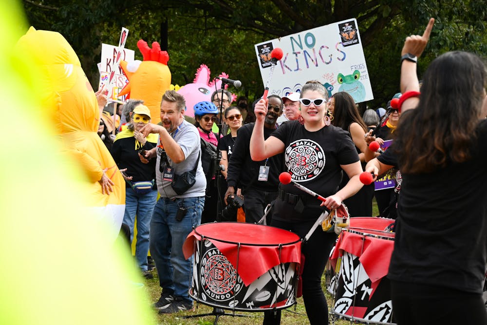 A drum line performed during the "No Kings" protest in Philadelphia on Oct. 18. Sydney Curran