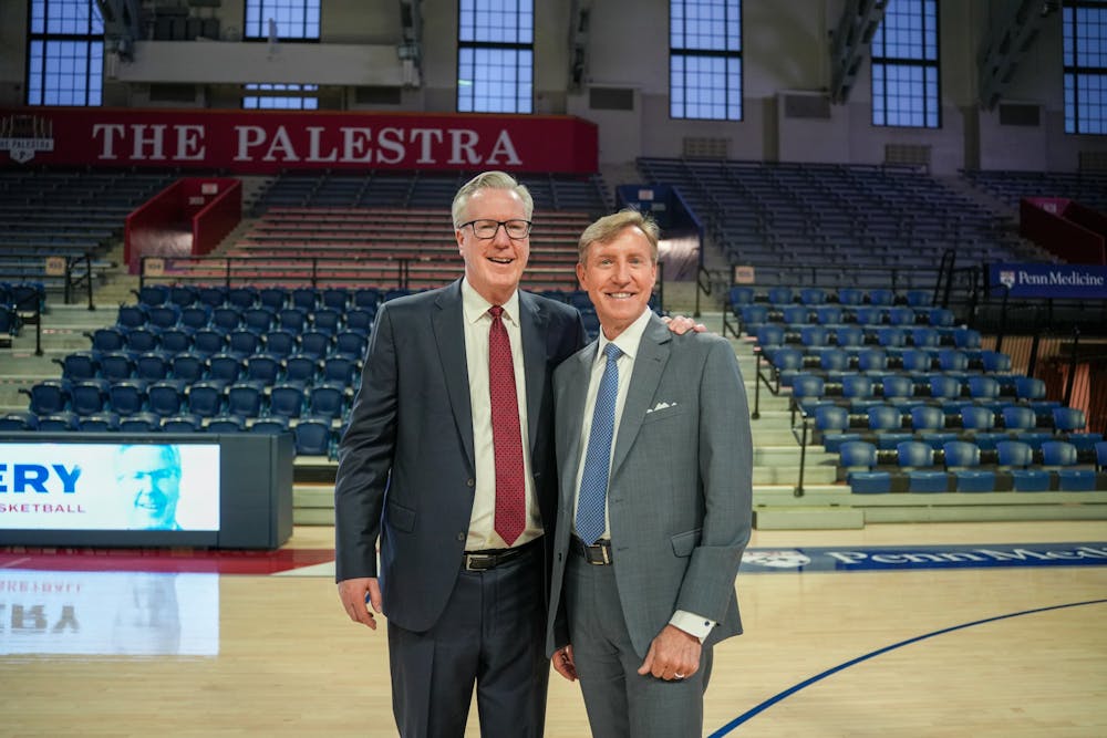Fran McCaffrey, the coach of Men's Basketball at a speech with Penn President Larry Jameson on Apr. 4. Lydia Tong